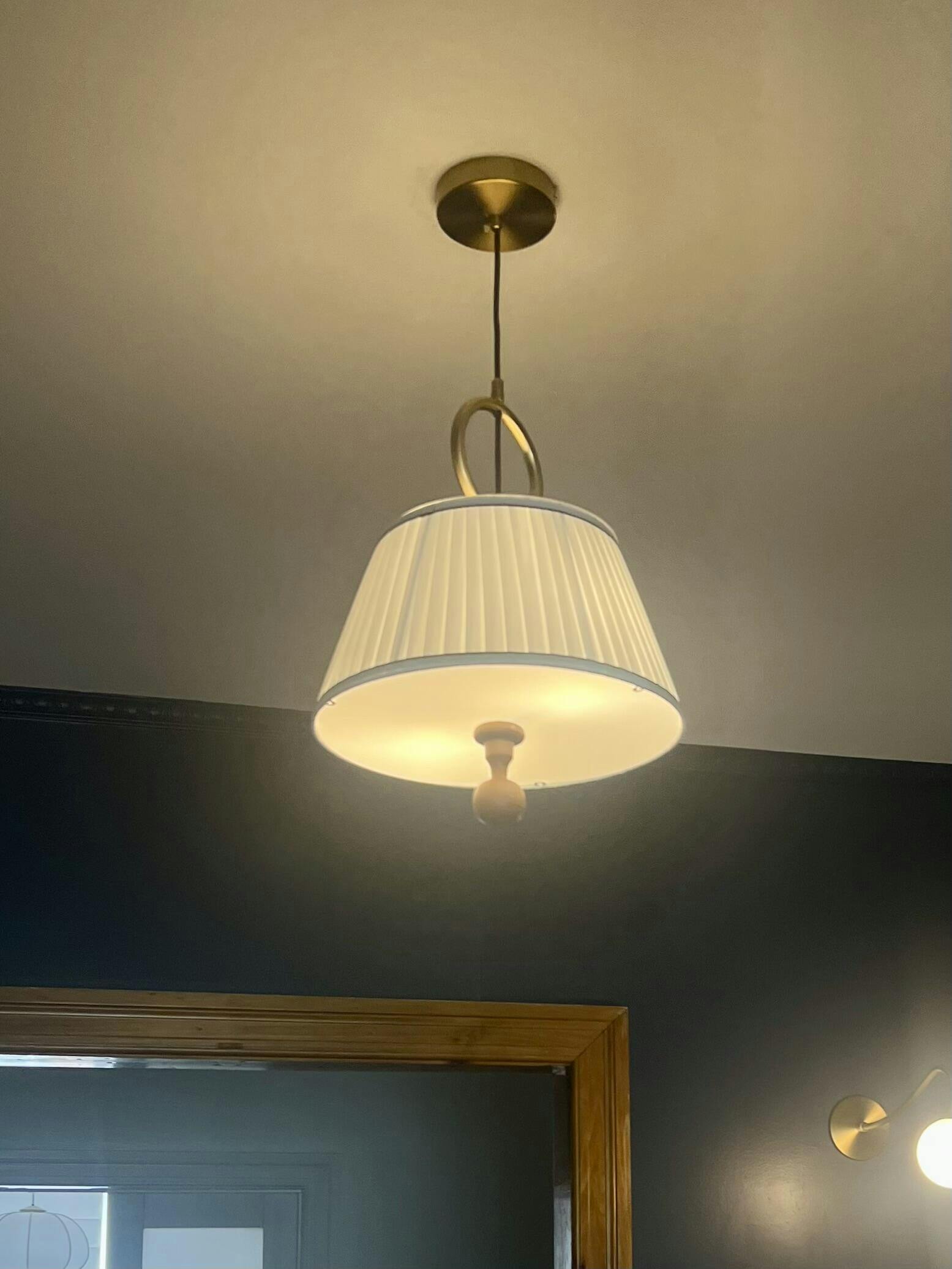 The keyminglighting Alina Pendant Lamp showcases a sophisticated and refined design that adds a timeless touch to any room. The pleated fabric shade. elegantly accented with a golden metal ring and a wood-textured ball at the base. creates a perfect harmony of modern and classic elements. The soft. diffused light creates a warm. inviting atmosphere. making it ideal for dining rooms. living areas. or contemporary kitchens.