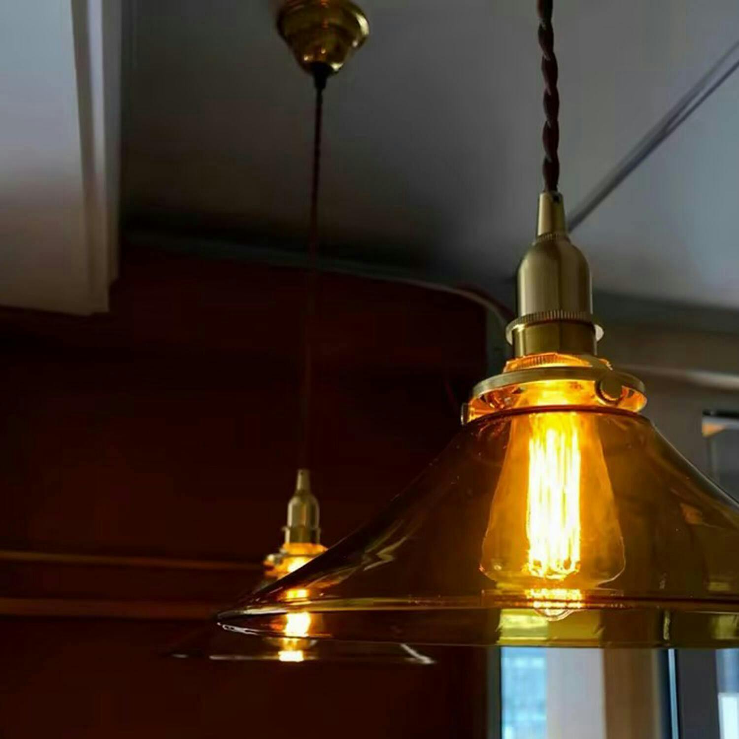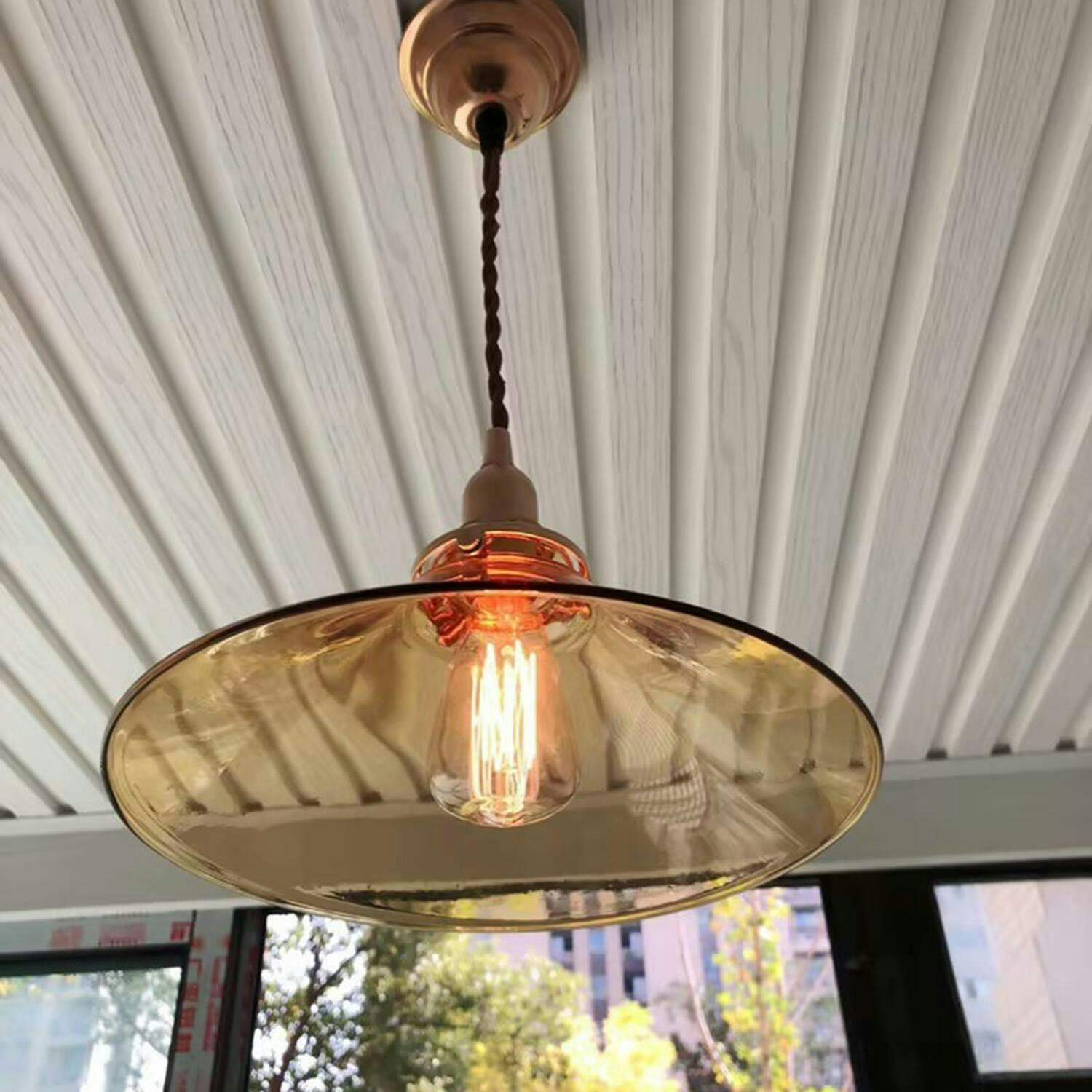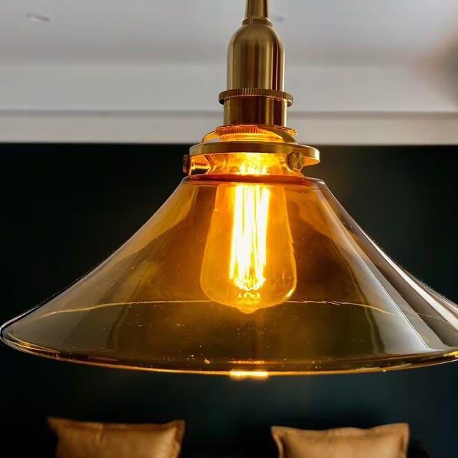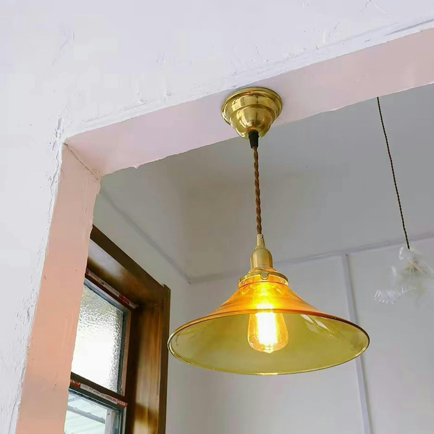 This Amber Glass Pendant Light is elegant and modern. It features a simple glass lampshade. perfect for adding light to a living room. dining room. or bedroom. This pendant light is made of brass and the glass is a warm brown color.
