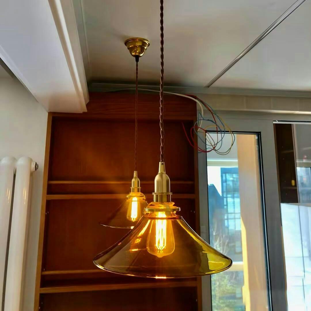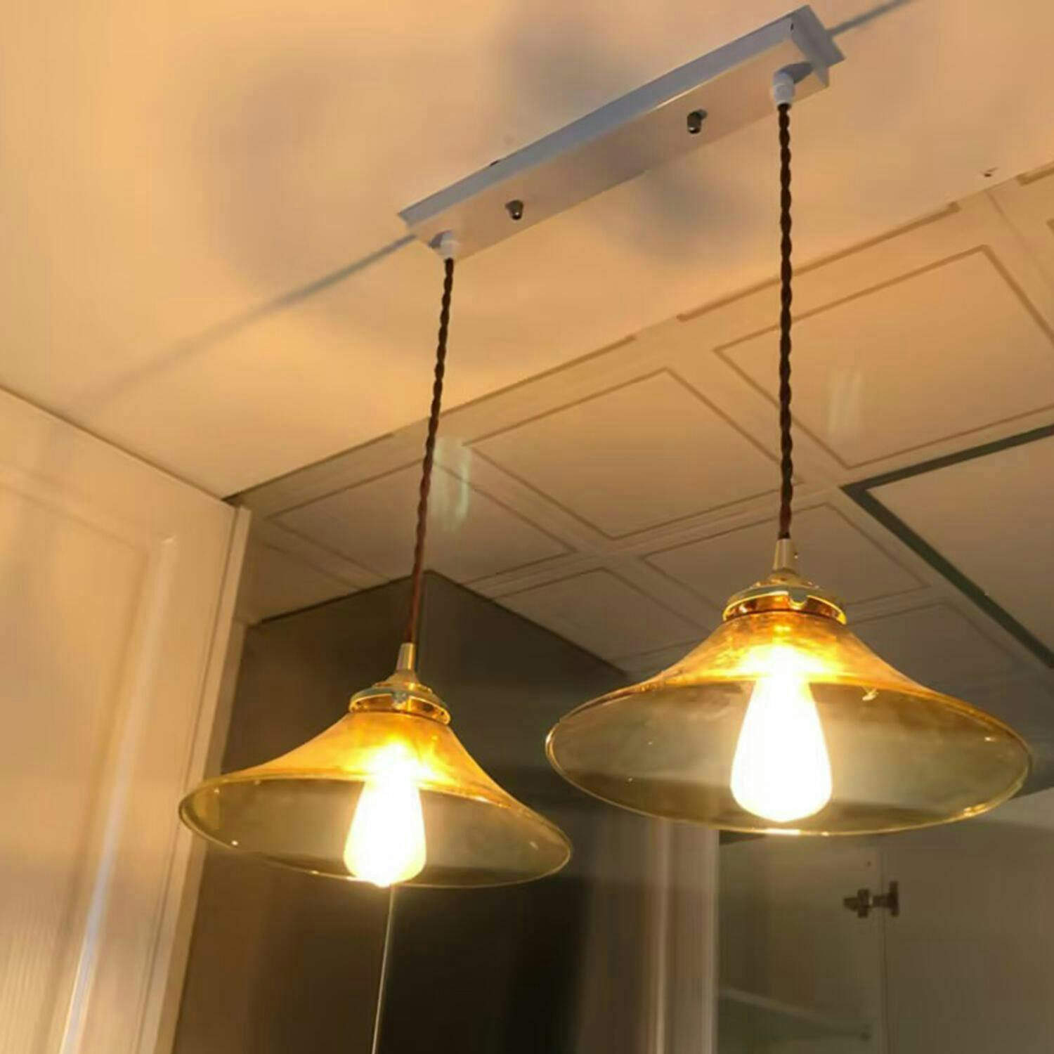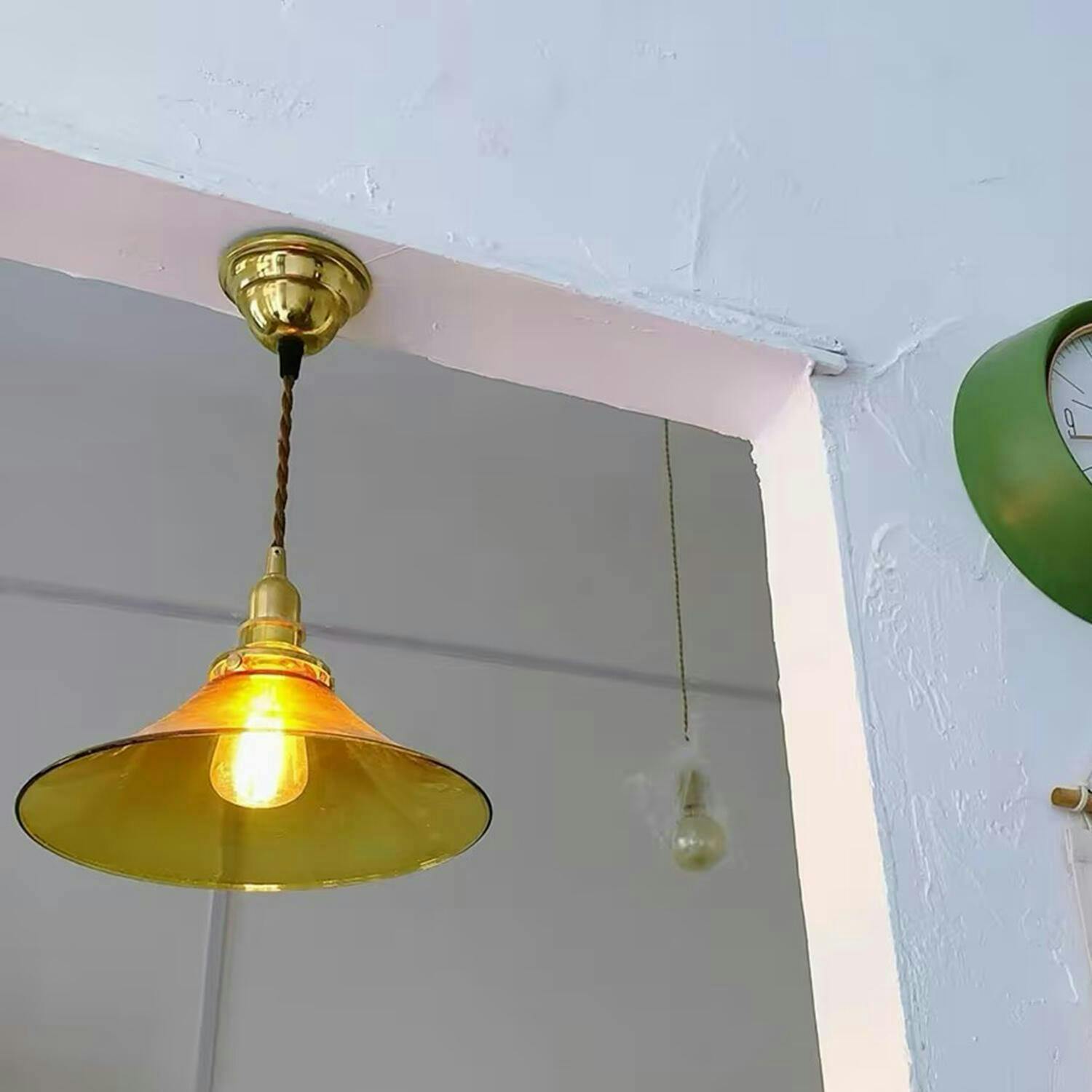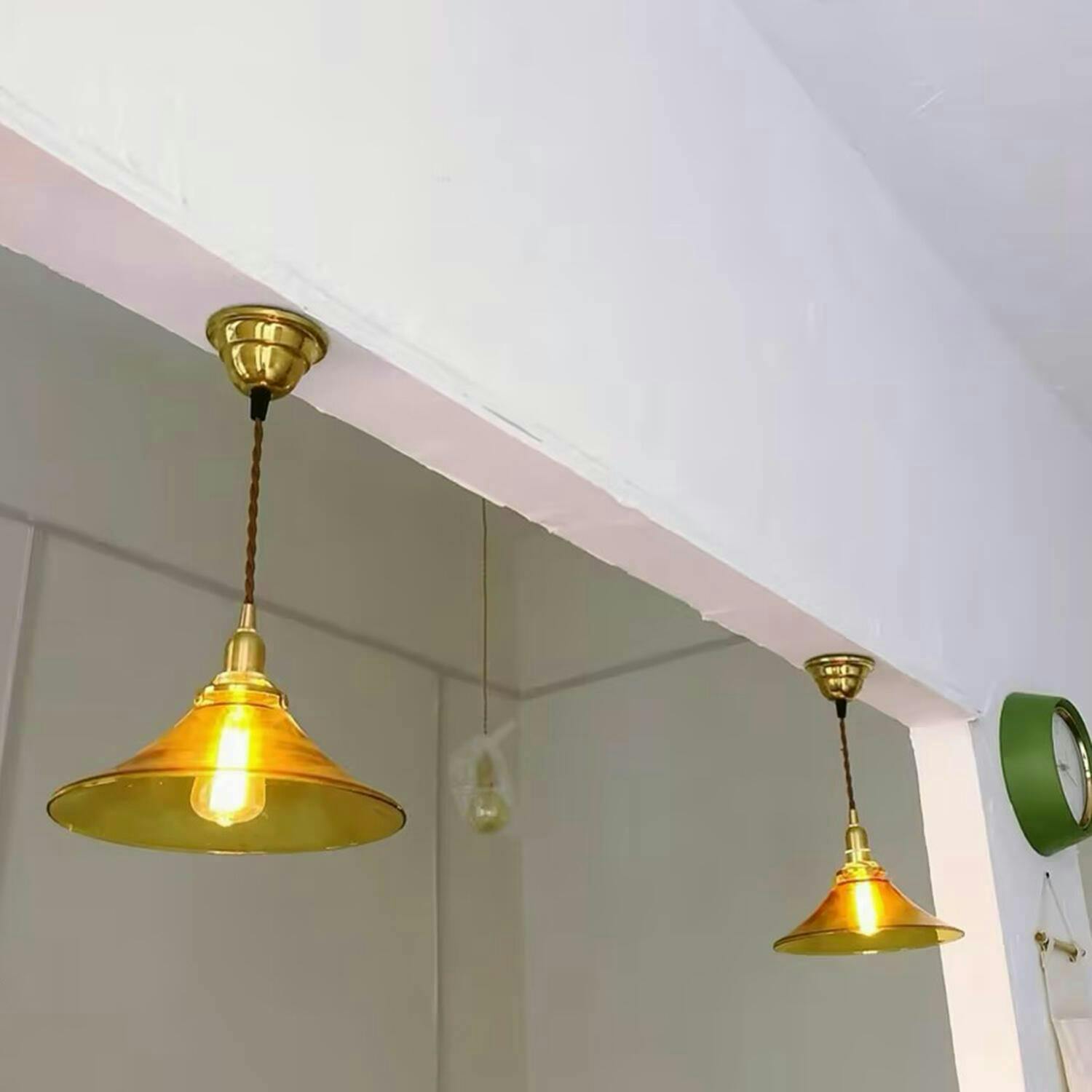 This Amber Glass Pendant Light is elegant and modern. It features a simple glass lampshade. perfect for adding light to a living room. dining room. or bedroom. This pendant light is made of brass and the glass is a warm brown color.