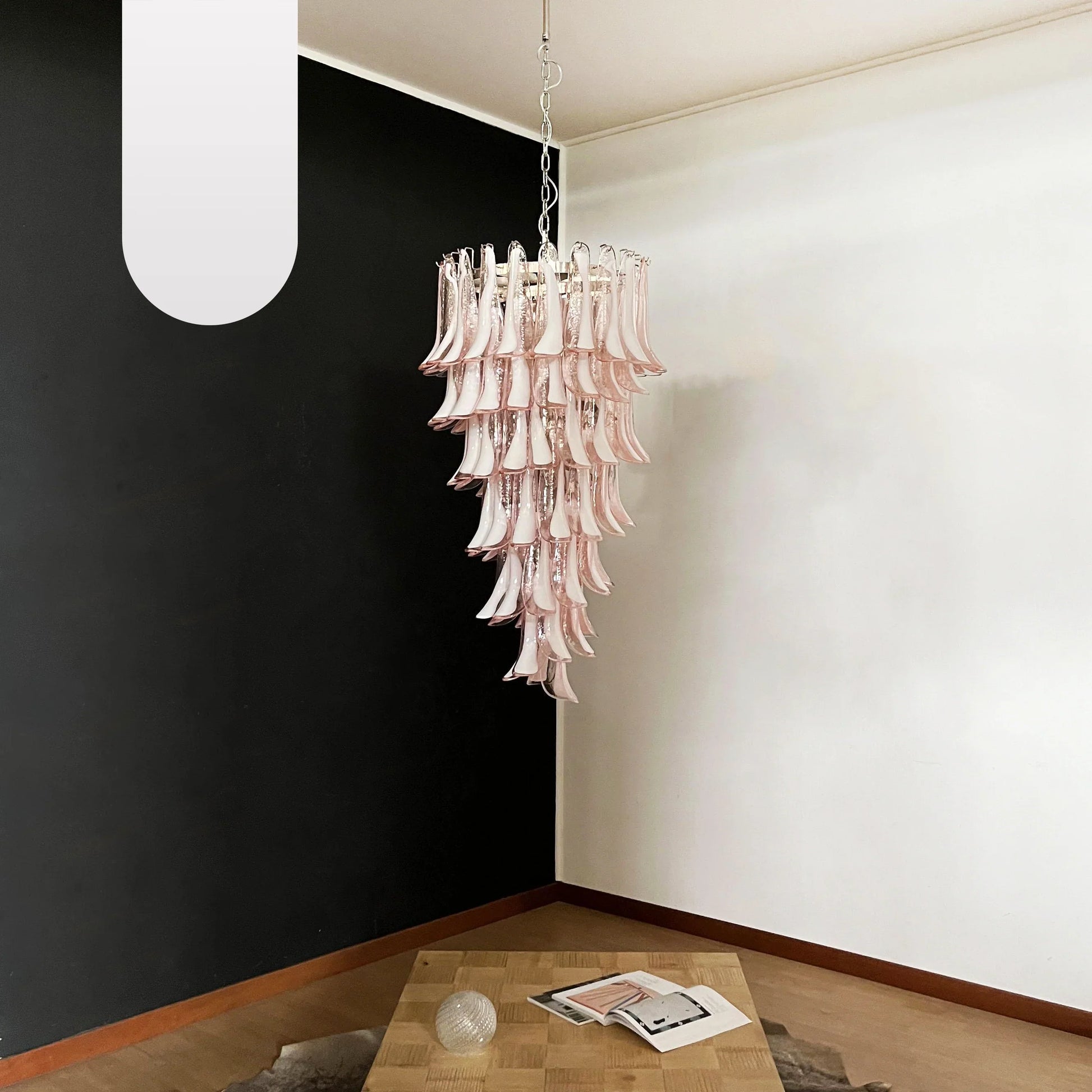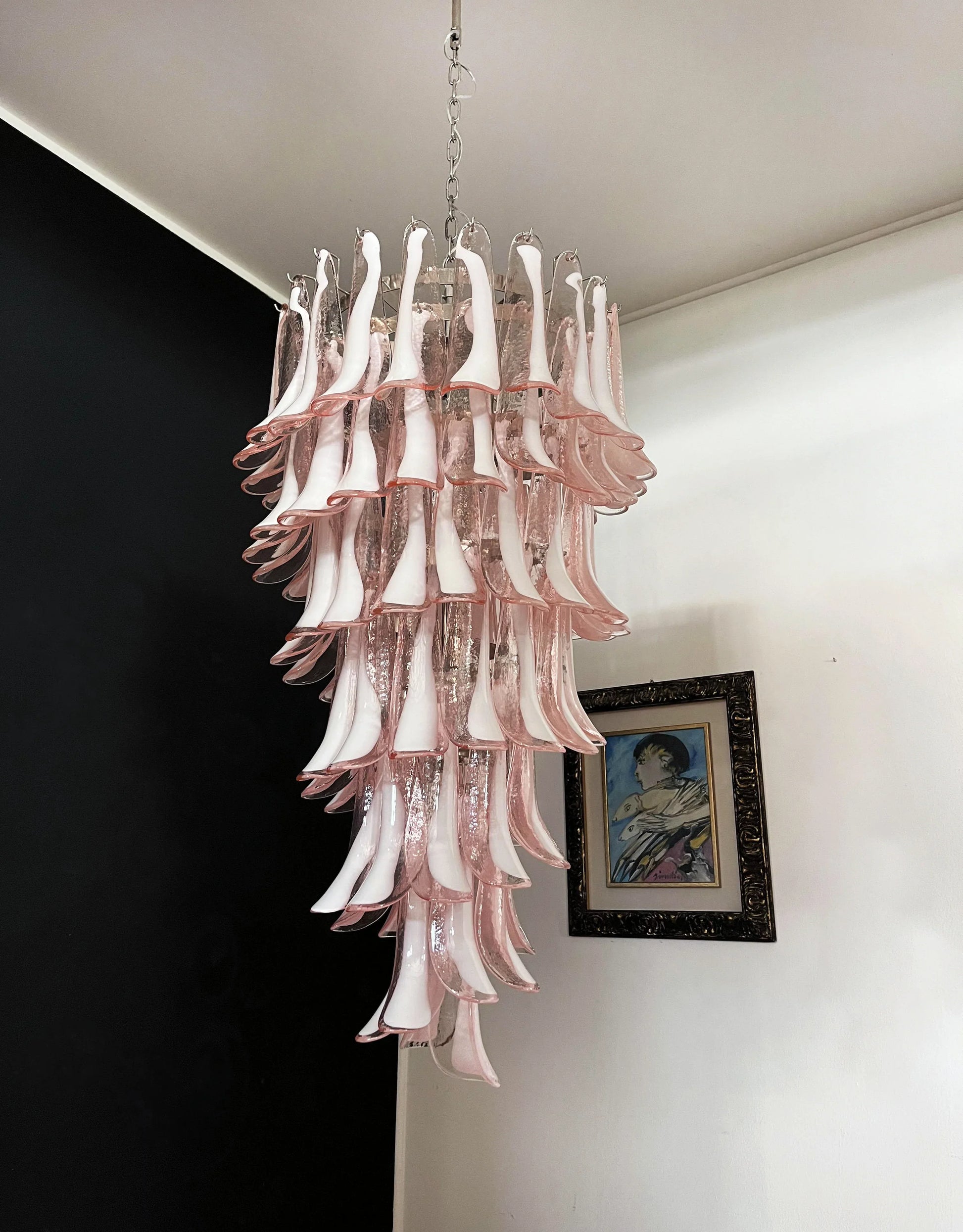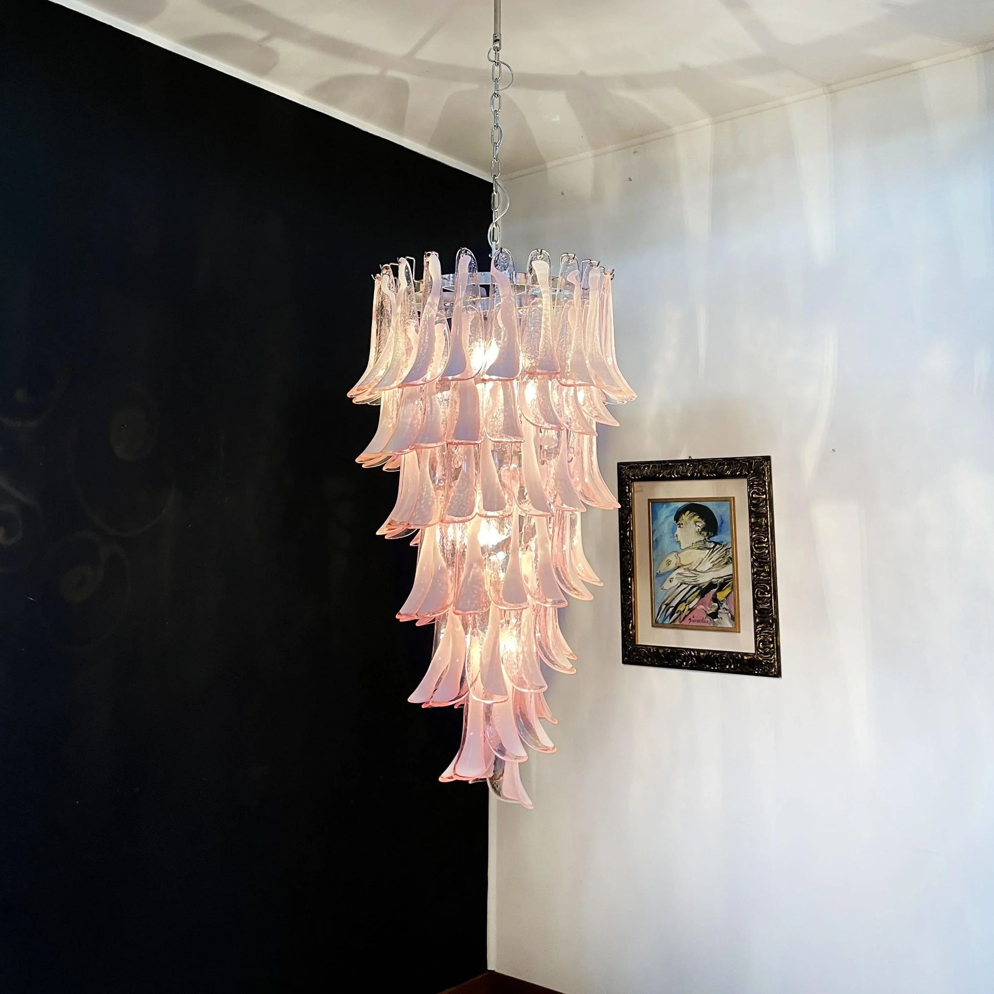 Transform your living space with the enchanting Beautiful Murano Pink Petals Spiral Chandelier. a stunning piece that combines artistic elegance with modern sophistication. Each petal is meticulously handcrafted. ensuring unique beauty and exceptional quality. Exquisite chandelier features pink glass petals arranged in a captivating spiral design. creating a breathtaking focal point in any room. Add this stunning piece to your space and enjoy the ambiance of refined luxury.