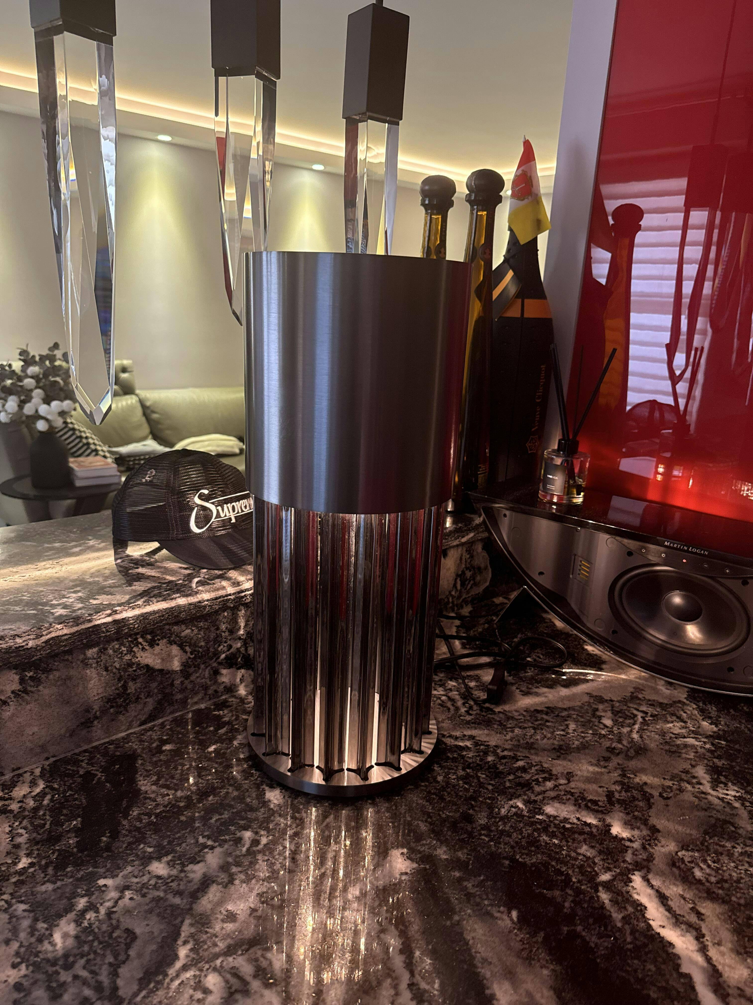 The sophisticated allure of this light comes from its precious materials and timeless lines that make an elegant and timeless Silhouette in the shape of a luminous cylinder with a brushed black structure on top. supported by a series of trihedrons made in crystal with an clear finish. The result is an object that reflects and diffuses light through its crystal elements and creates unique effects on whichever table or console it is placed.