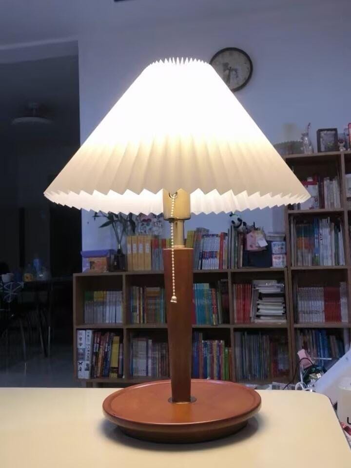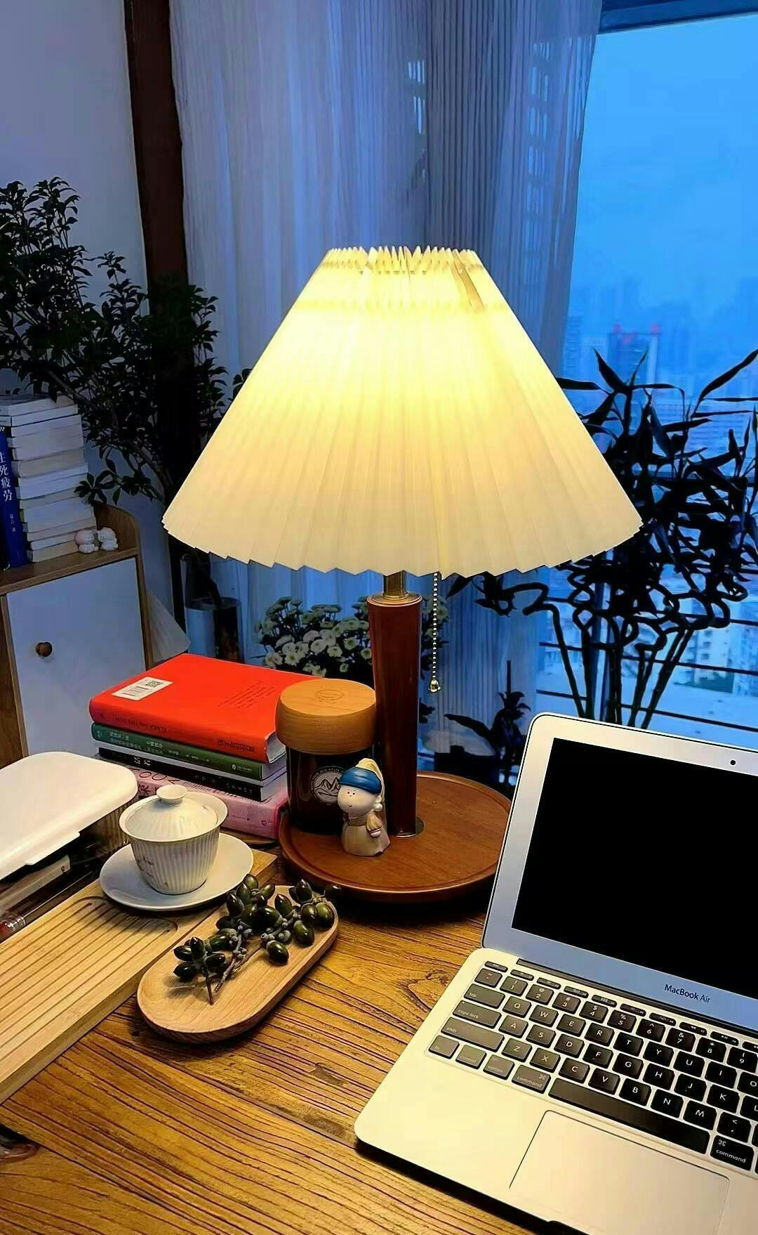 A Cone Pleated Fabric Table Lamp for keyminglighting. base made of solid wood and featuring a new white textured linen conical shade. The lamp body is decorated with golden brass.A very minimalist aesthetic.