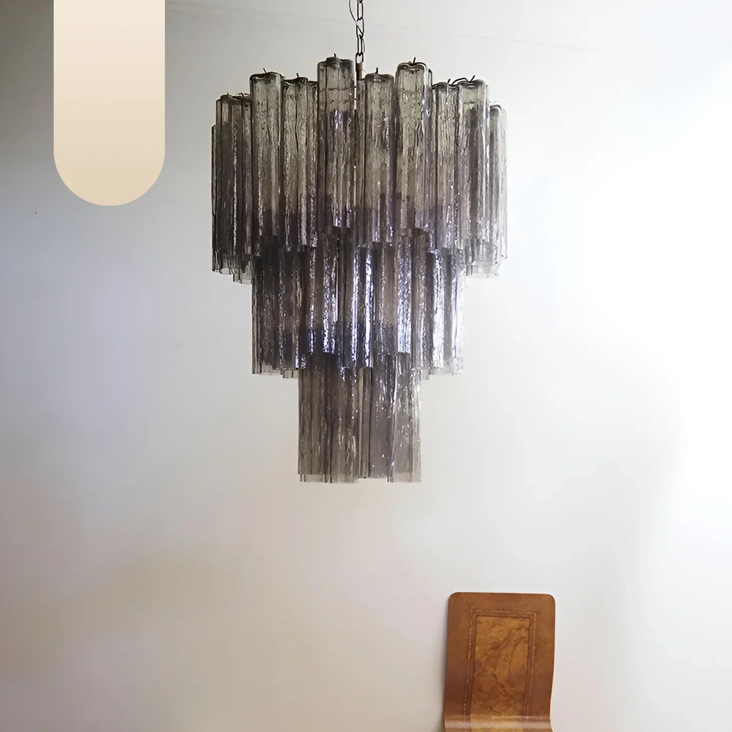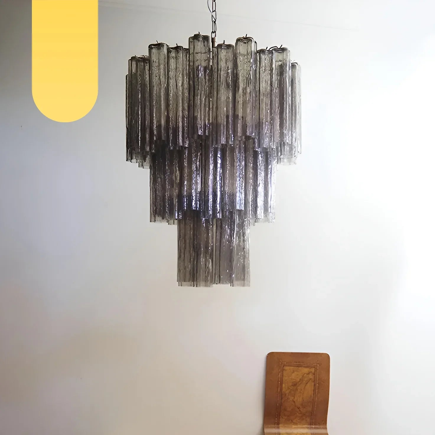 Elegant Smoke Murano Glass Tube Chandelier. an exquisite masterpiece that adds a touch of luxury to any interior. This chandelier is expertly handcrafted and features stunning Smoke glass star tubes that create a mesmerizing light and beauty. Transform your space and enjoy the perfect blend of art and lighting. Illuminate your home with this stunning centerpiece for an ambience of sophisticated luxury.