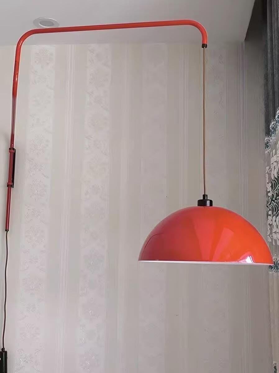 The lamp has a swiveling. fully adjustable stem. The 40 cm diameter shade is height adjustable with a black metal counterweight with integrated light switch. It has a large reach and could very well double as table and reading lamp in an small apartment or (home) office.