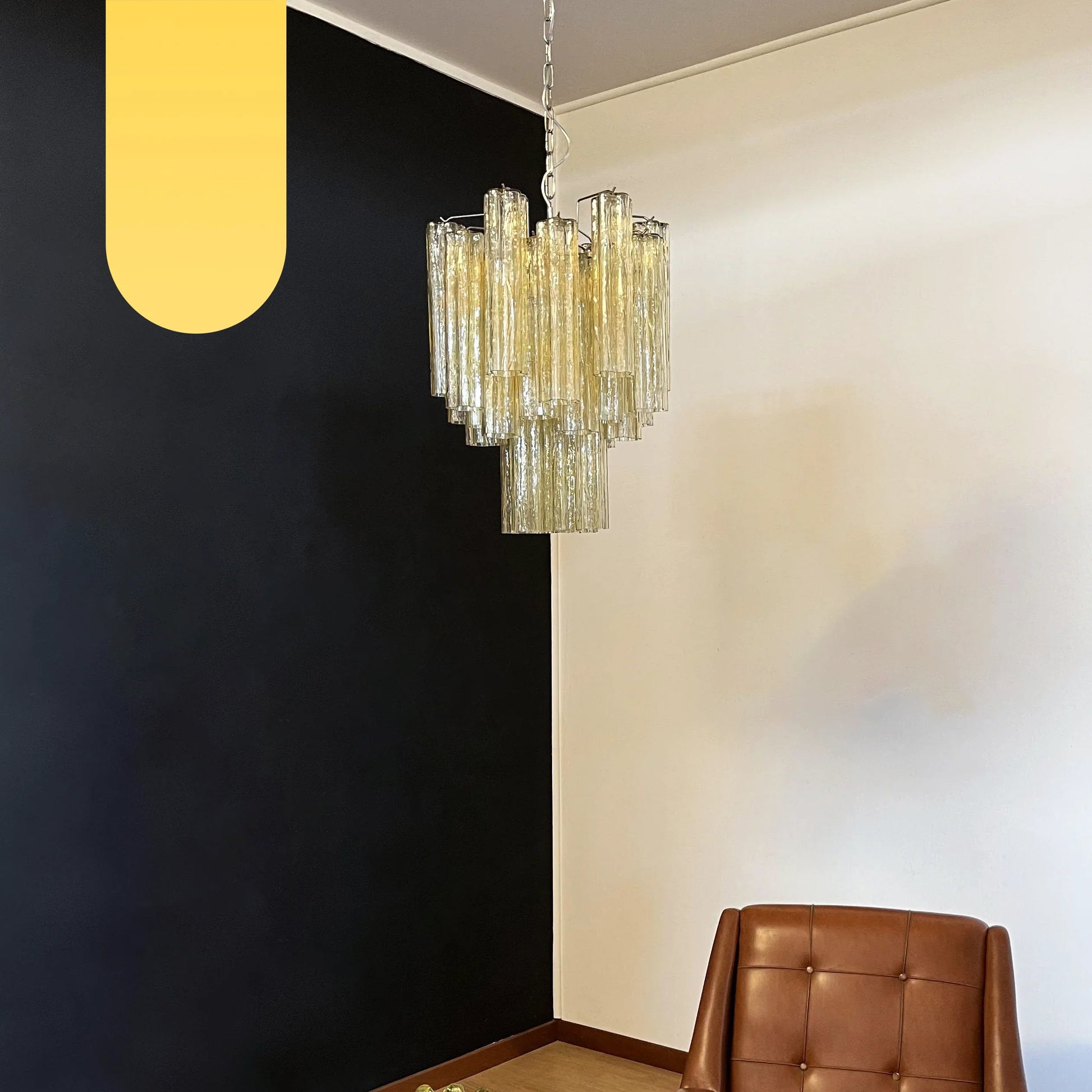 Experience the combination of sophistication and contemporary design with the Fantastic Amber Murano Glass Tube Chandelier. Expertly crafted with glass and metal structure. this chandelier adds a touch of color and radiant luminosity to any space. Meticulously shaped to perfection. it showcases the mastery of its creators in both form and function.