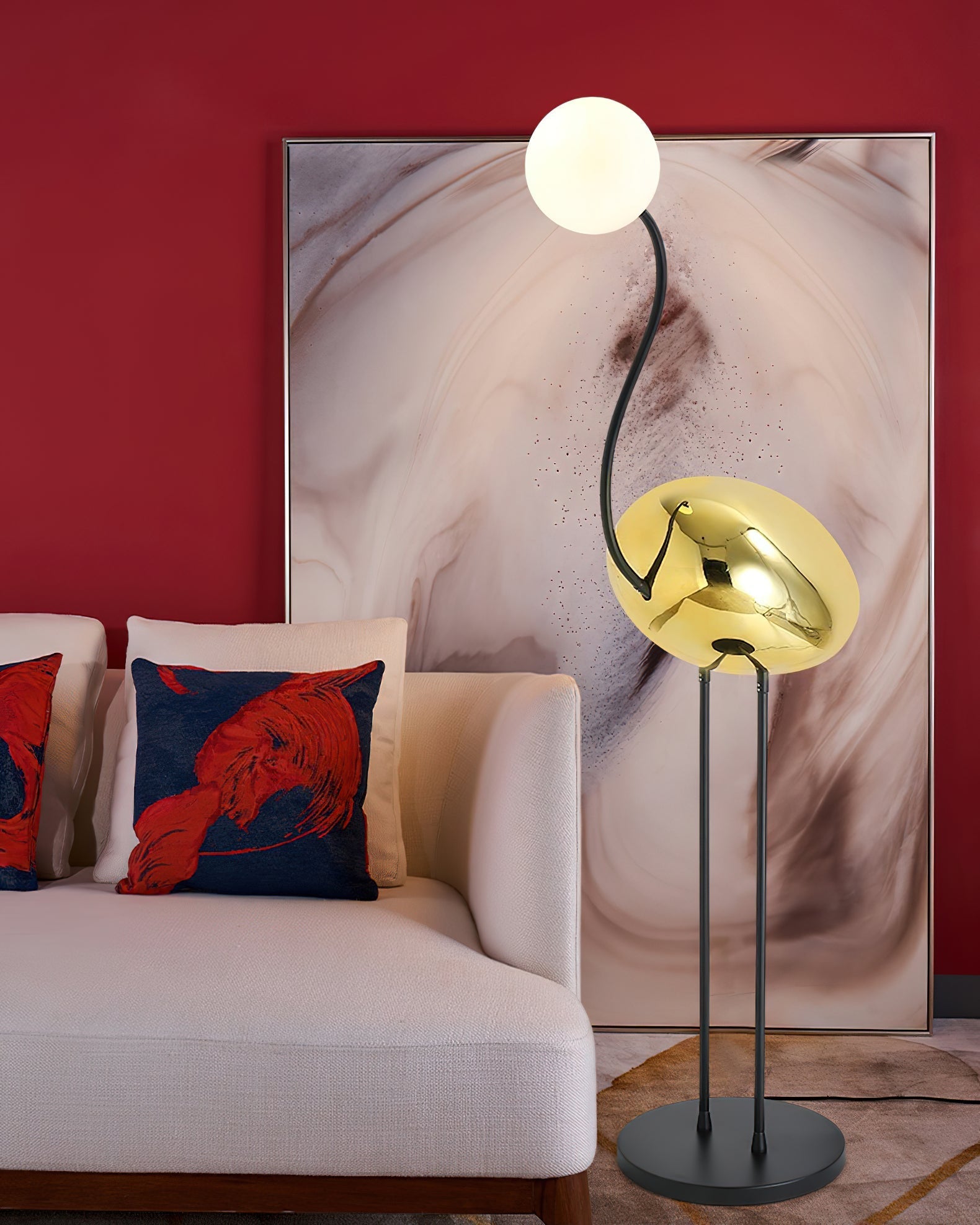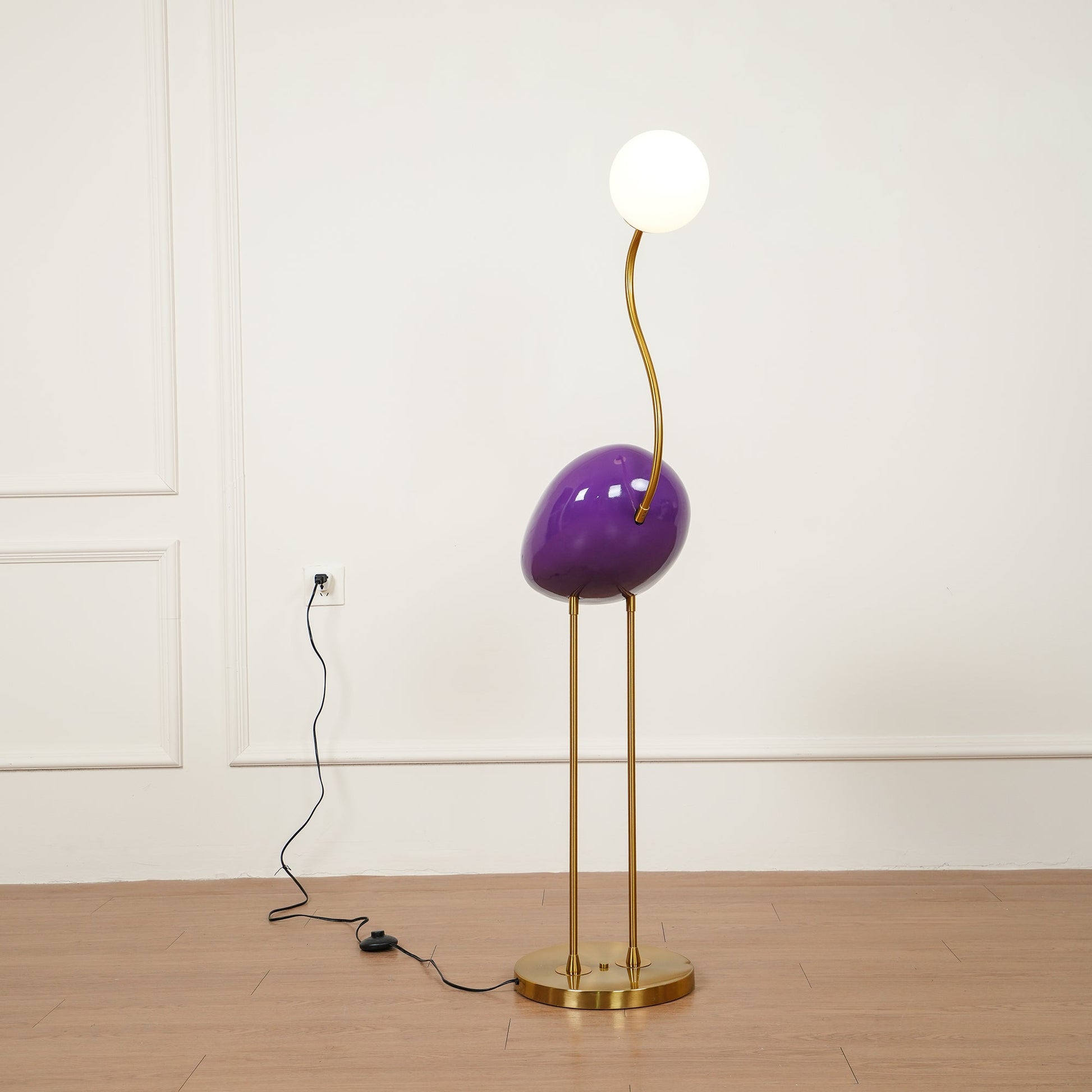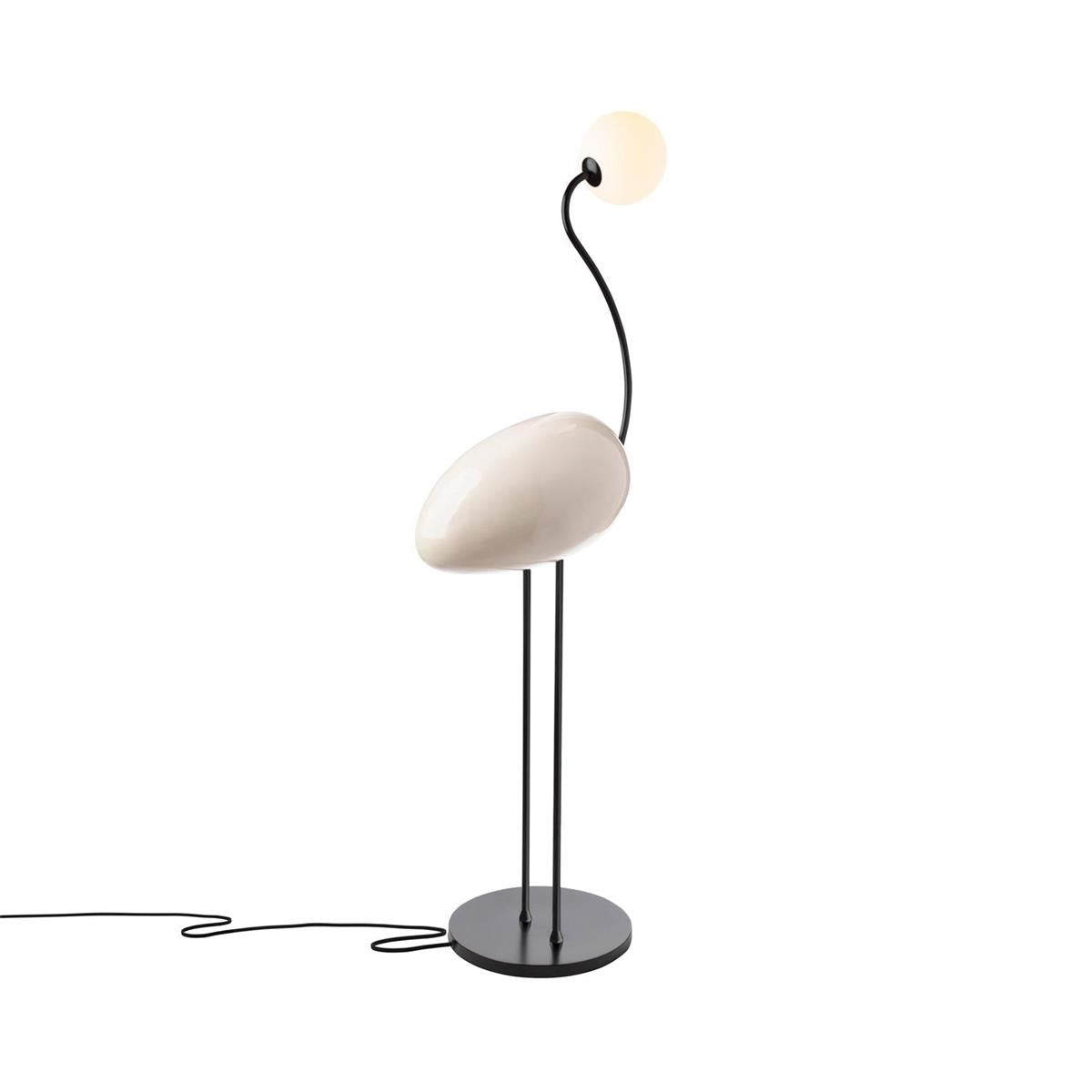 Elevated by two legs and base. this floor lamp features an white glass diffuser that sits on a curved neck extending from a painted resin body. This collection is marked by modern elements that will enrich the profile of any space. Deep tones with elegant details reflect precision balanced by grace and beauty.