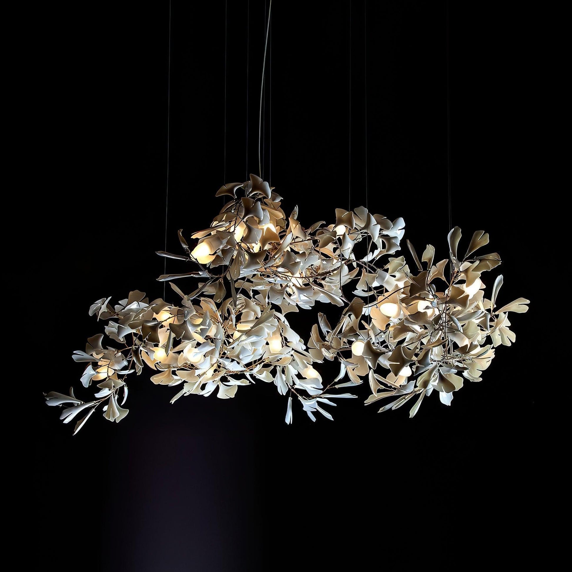 Gingko Chandeliers are impressive bespoke installations. composed of handcrafted porcelain leaves. The interplay between ceramic and light has the power to create a sense of wellbeing and a warm atmosphere. The light sculpture goes much further than its functional purpose of lighting a space. By illuminating itself. it defines its own shape and presence. becoming a mesmerizing artwork. Like a living plant. it has a natural. dynamic energy that both calms and revitalizes us. The design of the installations goes hand in hand with the architectural space and with the ideas of the architects and interior designers.