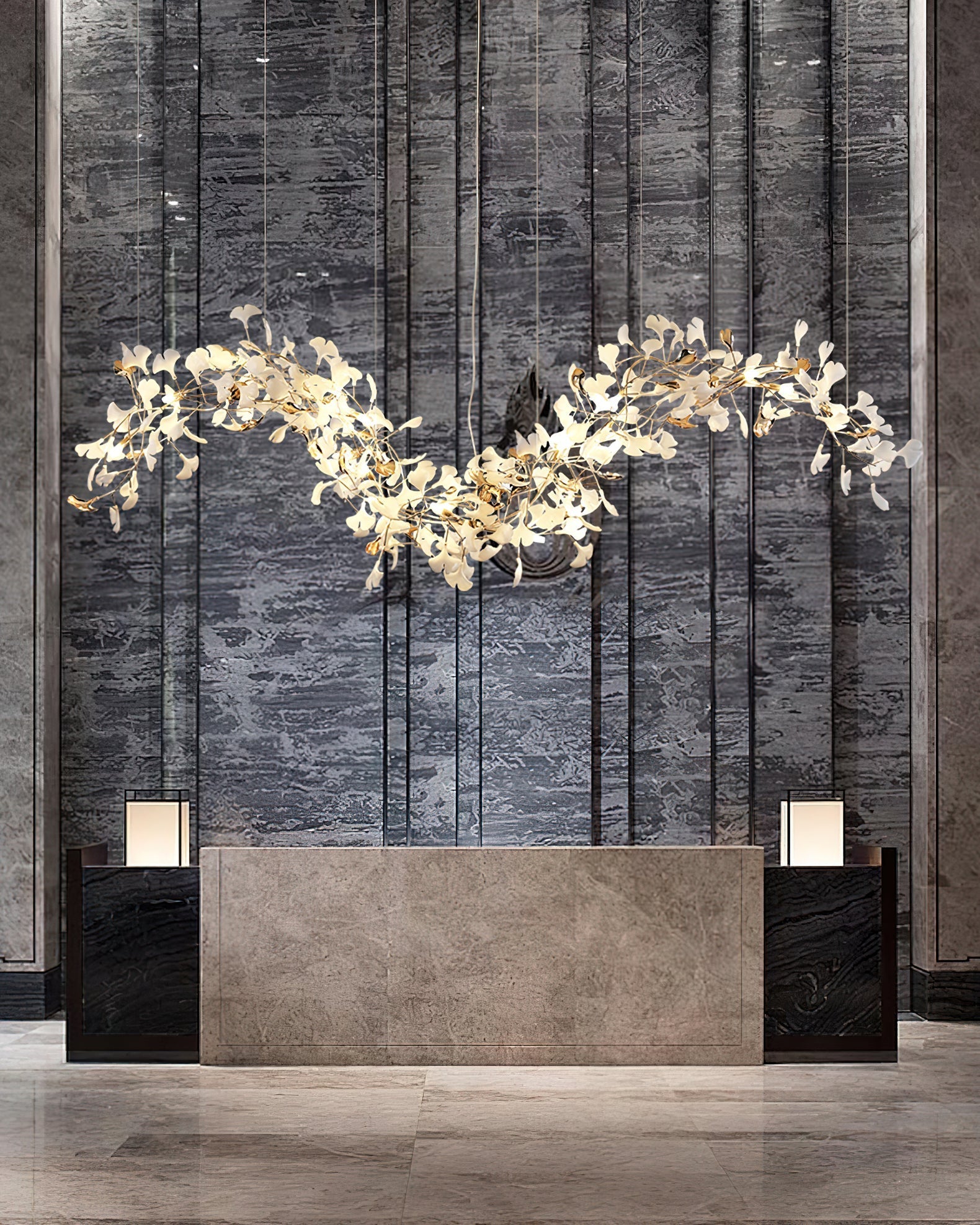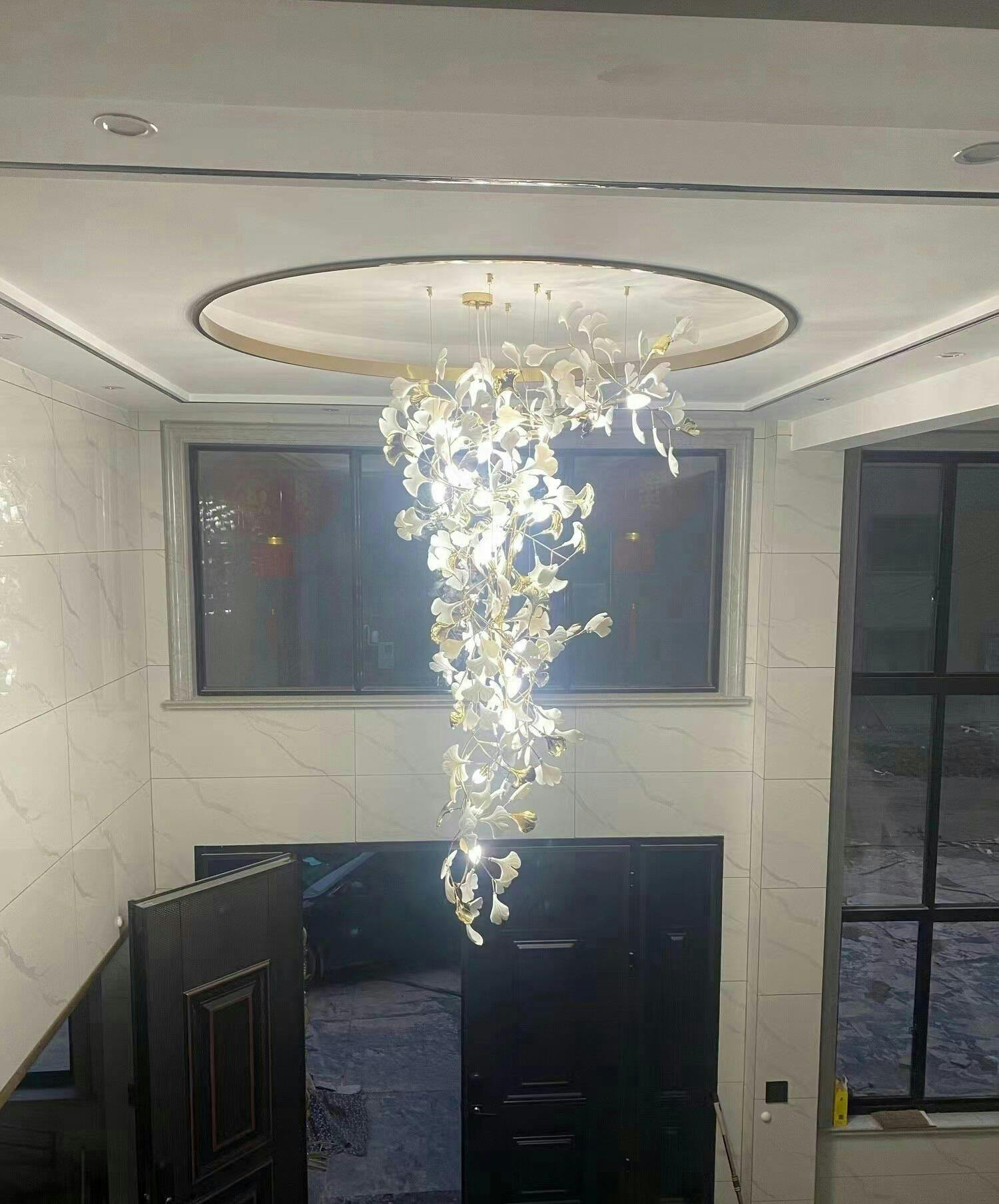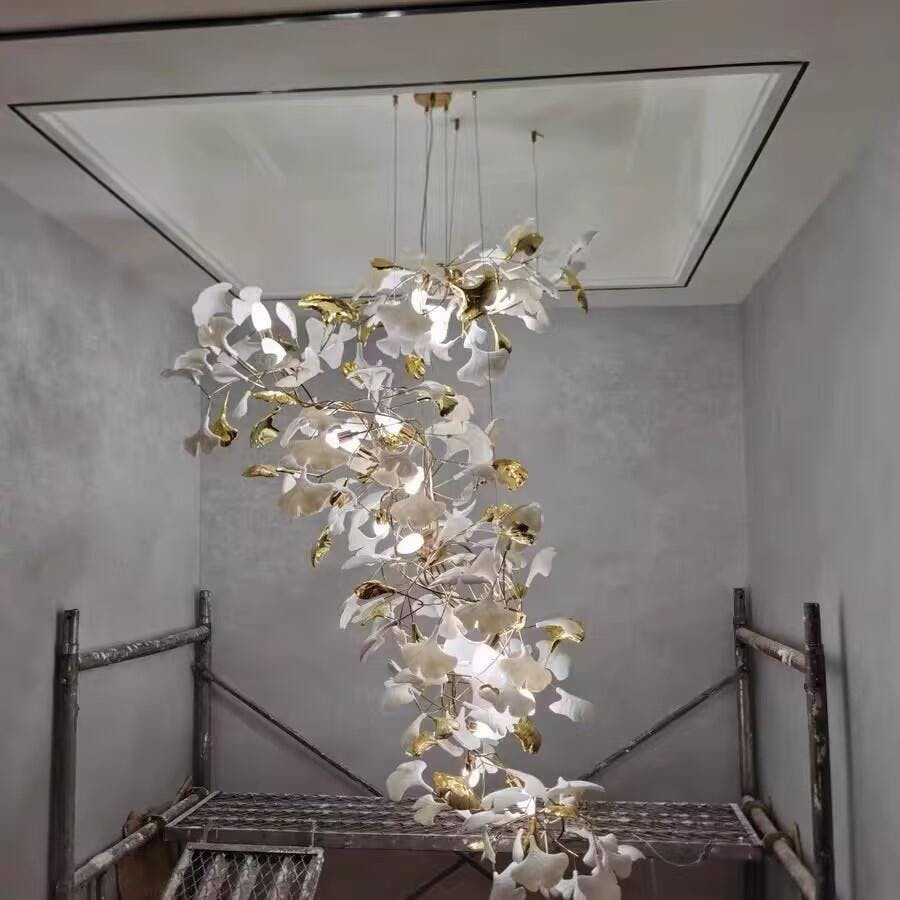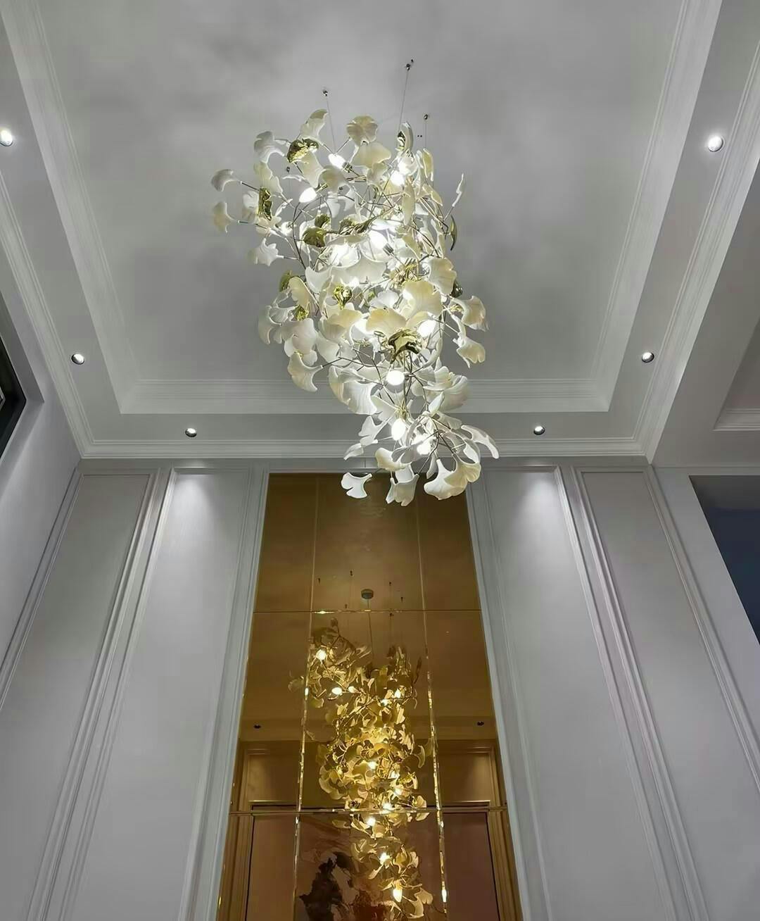 Gingko Chandeliers are impressive bespoke installations. composed of handcrafted porcelain leaves. The interplay between ceramic and light has the power to create a sense of well-being and warm atmosphere. The light sculpture goes much further than its functional purpose of lighting a space. By illuminating itself. it defines its own shape and presence. becoming a mesmerizing artwork. Like a living plant. it has a natural. dynamic energy that both calms and revitalizes us. The design of the installations goes hand in hand with the architectural space and with the ideas of the architects and interior designers.