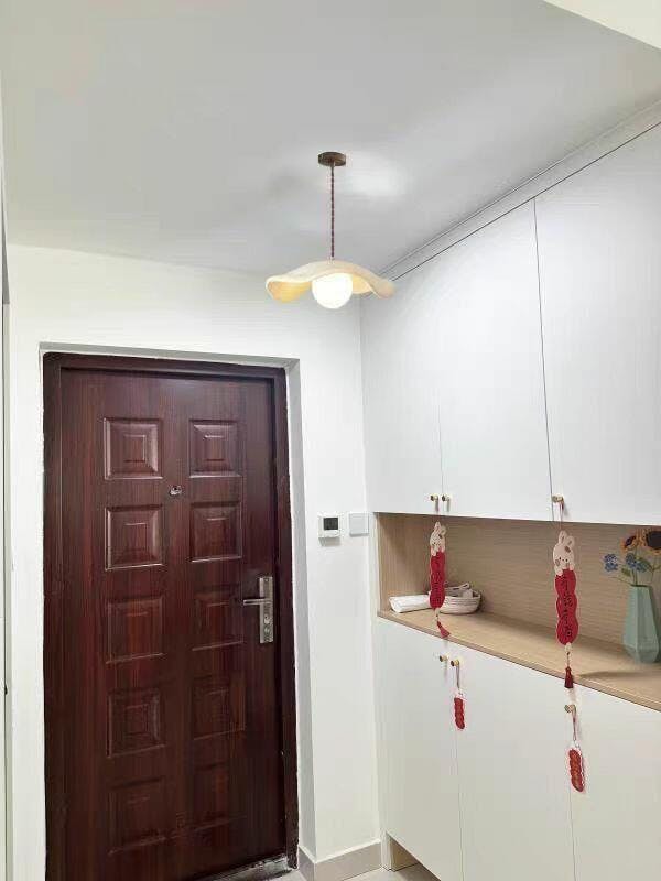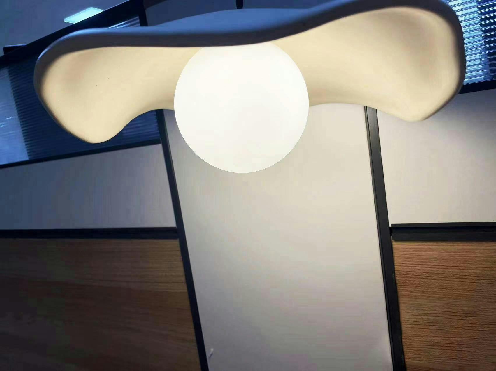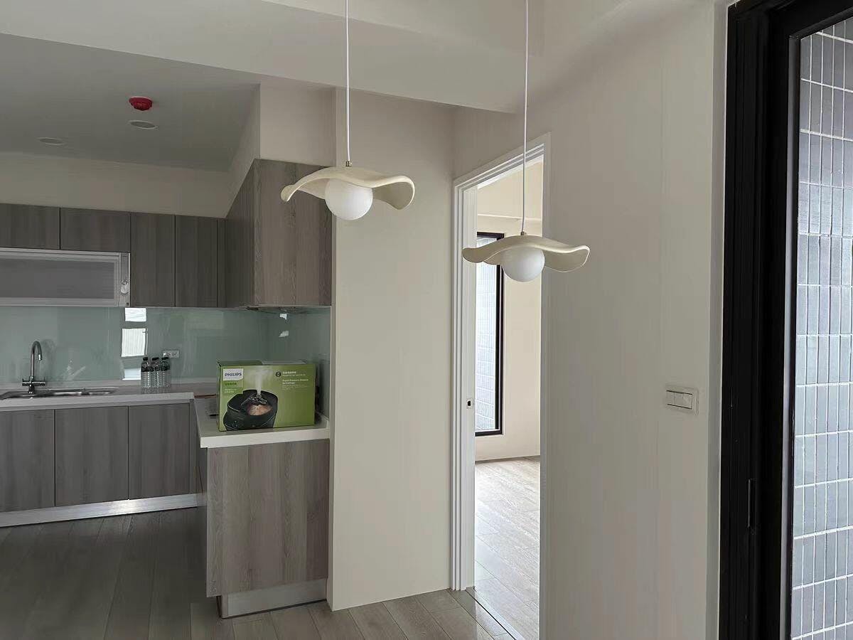 This is a resin pendant lamp from keyminglighting. It features a curved edge line that looks like a simple hat-shaped shade that has been distorted by applying force. The slight change gives it a unique floating feeling and movement. and the expression changes depending on the viewing angle. so you won't get bored.