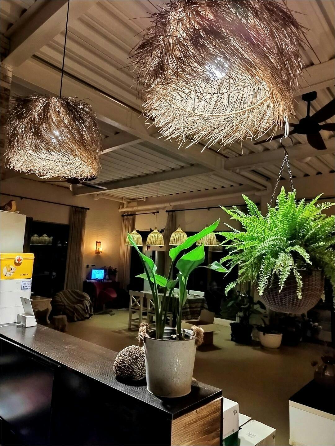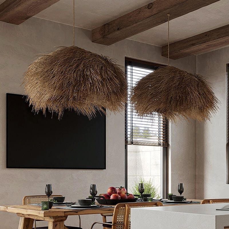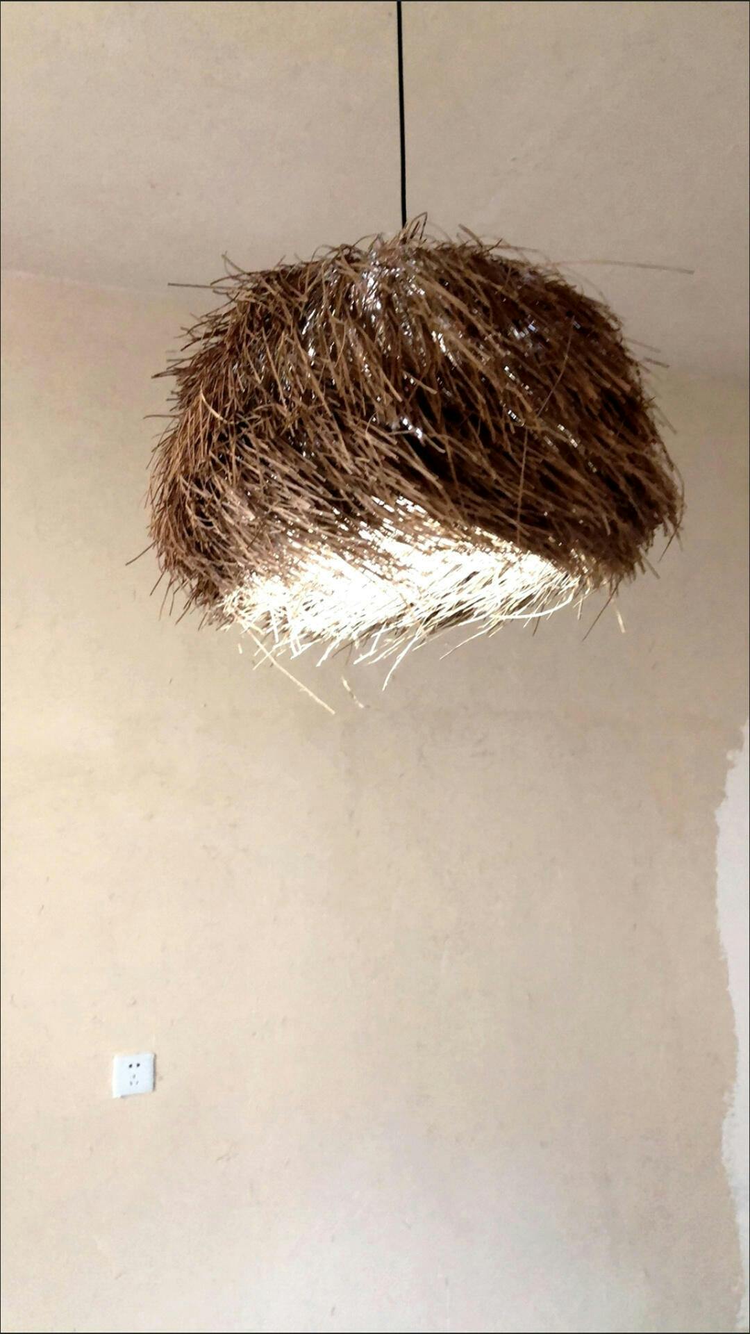 Woven from natural wicker. the pendant boasts a conical shape that tapers with an effortless grace. The intertwining strands of the wicker create a semi-transparent cloak around the light. allowing for a soft. mellow glow that resembles the last light of sunset. This light fixture is suspended by a slender. unassuming metal cord that complements its rustic charm without distraction.