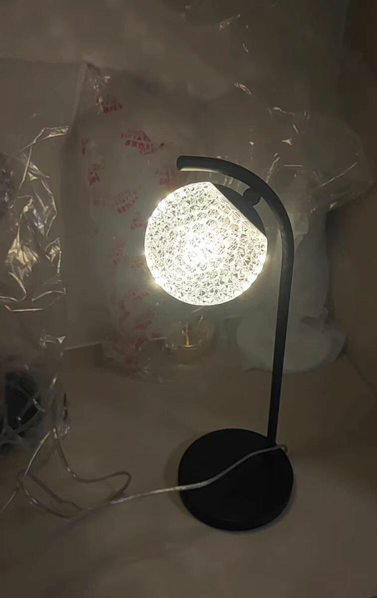Reminiscent of a delicate dandelion puff. our table lamp is fitted with a multitude of wire arms that burst forth from the center. each supporting a small faceted crystal to sparkle day and night.
