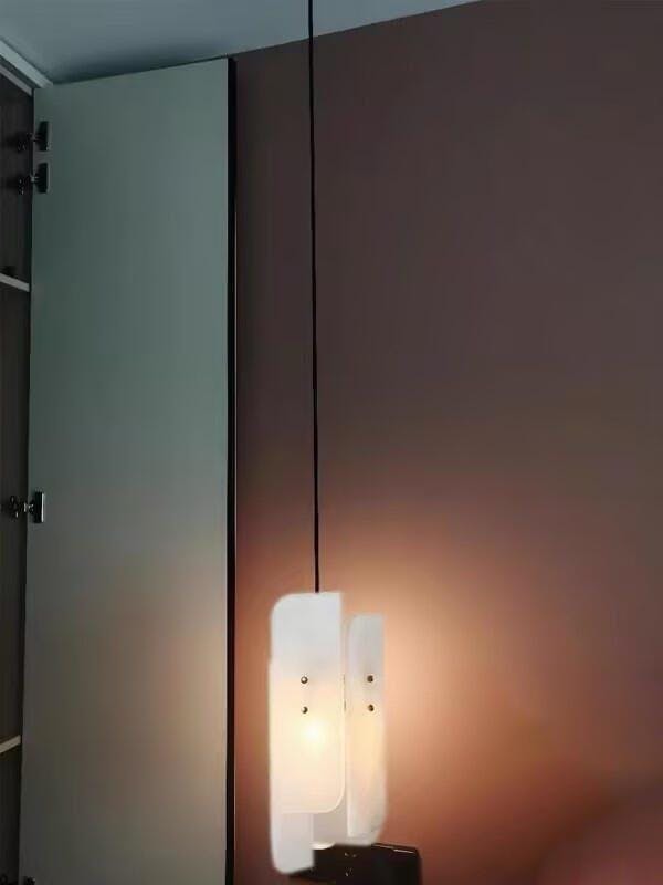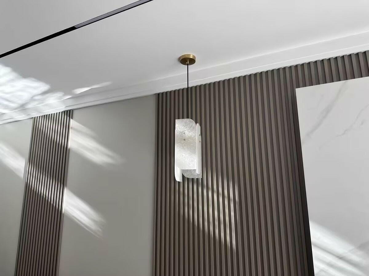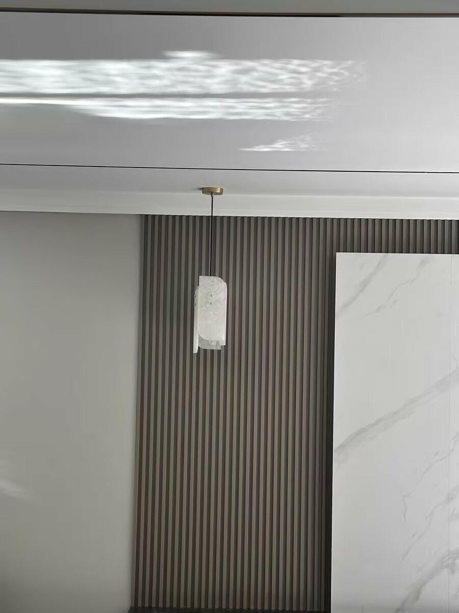 The alabaster collection mimics crystalline formations found in nature. Hand cutting alabaster shades are suspended from brass-plated airplane cables. delicate brass rods. and hand-shaped brass hardware.