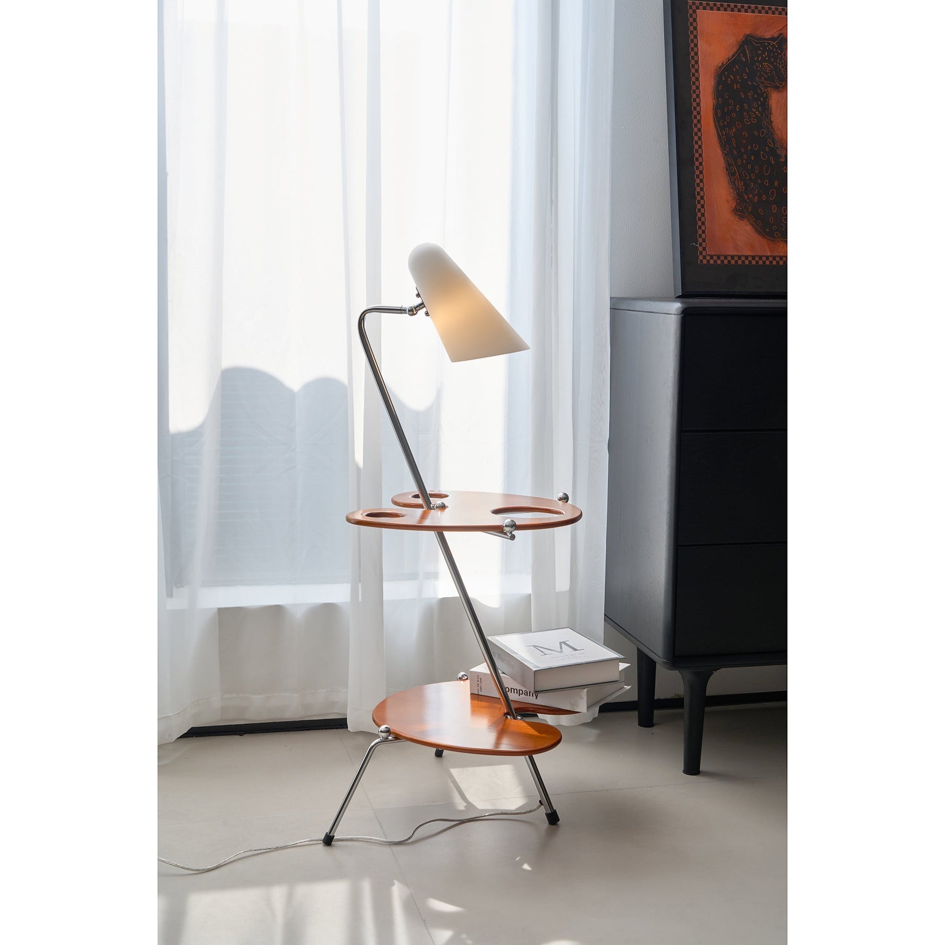 Intertwining elegance and function. the Melder Floor Lamp transcends ordinary lighting to become a versatile design element. The sturdy metal frame boasts dual-tiered wooden shelves. providing storage space without compromising its airy aesthetic. Adjustable opal shade emits a warm. inviting light for ambiance and reading.