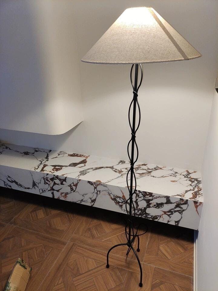 A sleek and artistic floor lamp featuring a black wrought-iron base with an intricate twisted design. The tapered fabric lampshade diffuses light softly. making it a refined addition to modern or industrial interiors.