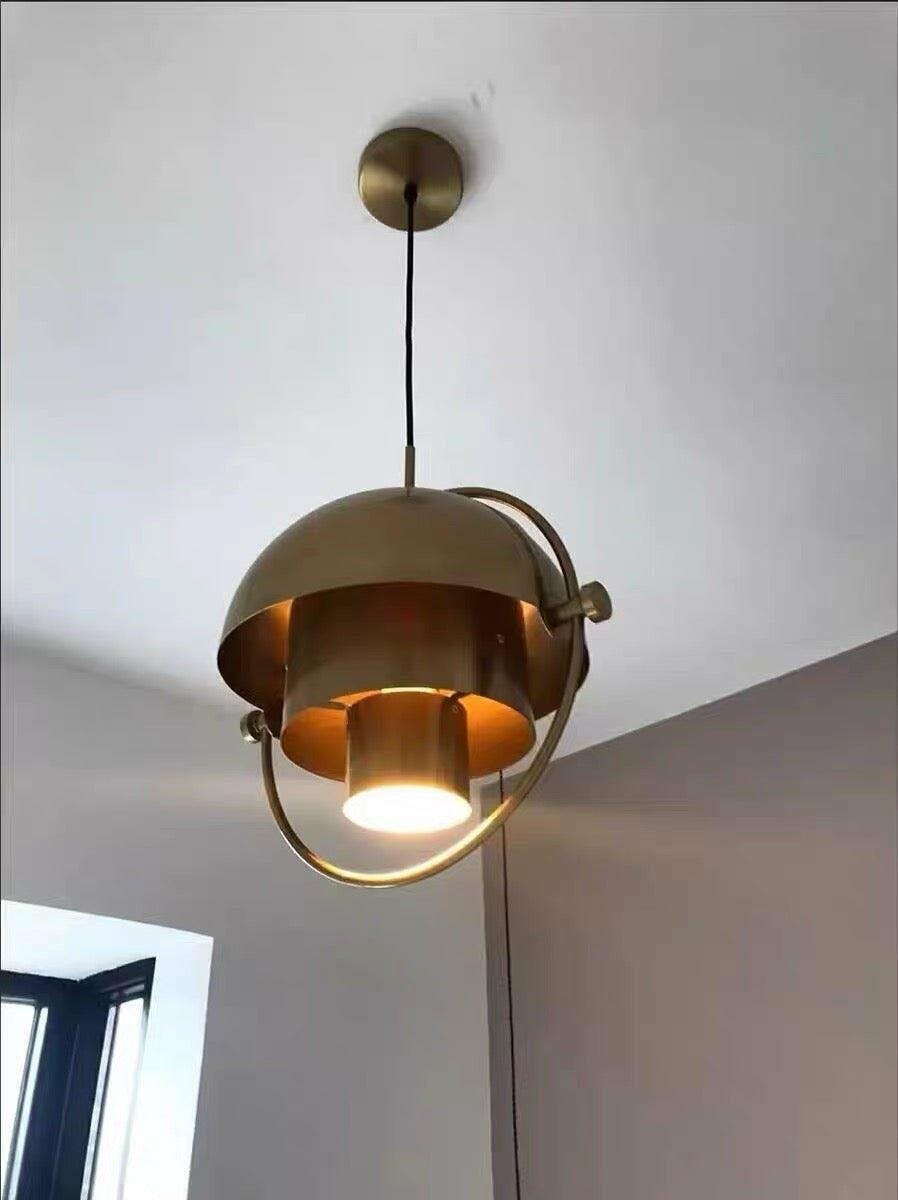 The Multi-Lite pendant lamp from 1972. The design is characterized by an exceptional and playful lampshade that reflects Weisdorf's passion for versatility: The base of the lamp consists of three basic shapes - two immovable cylinders and a hemisphere - framed by a thin ring. What makes it special? The hemisphere is divided into two parts so that the two halves are mobile and invite you to play with shapes and light.