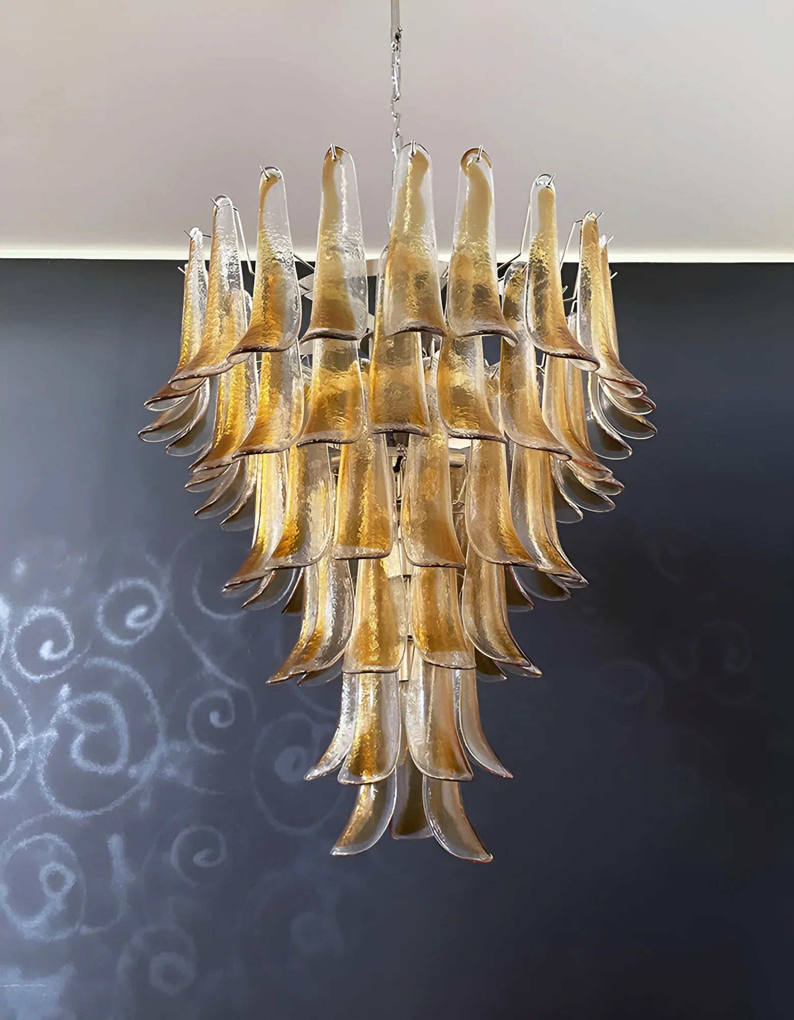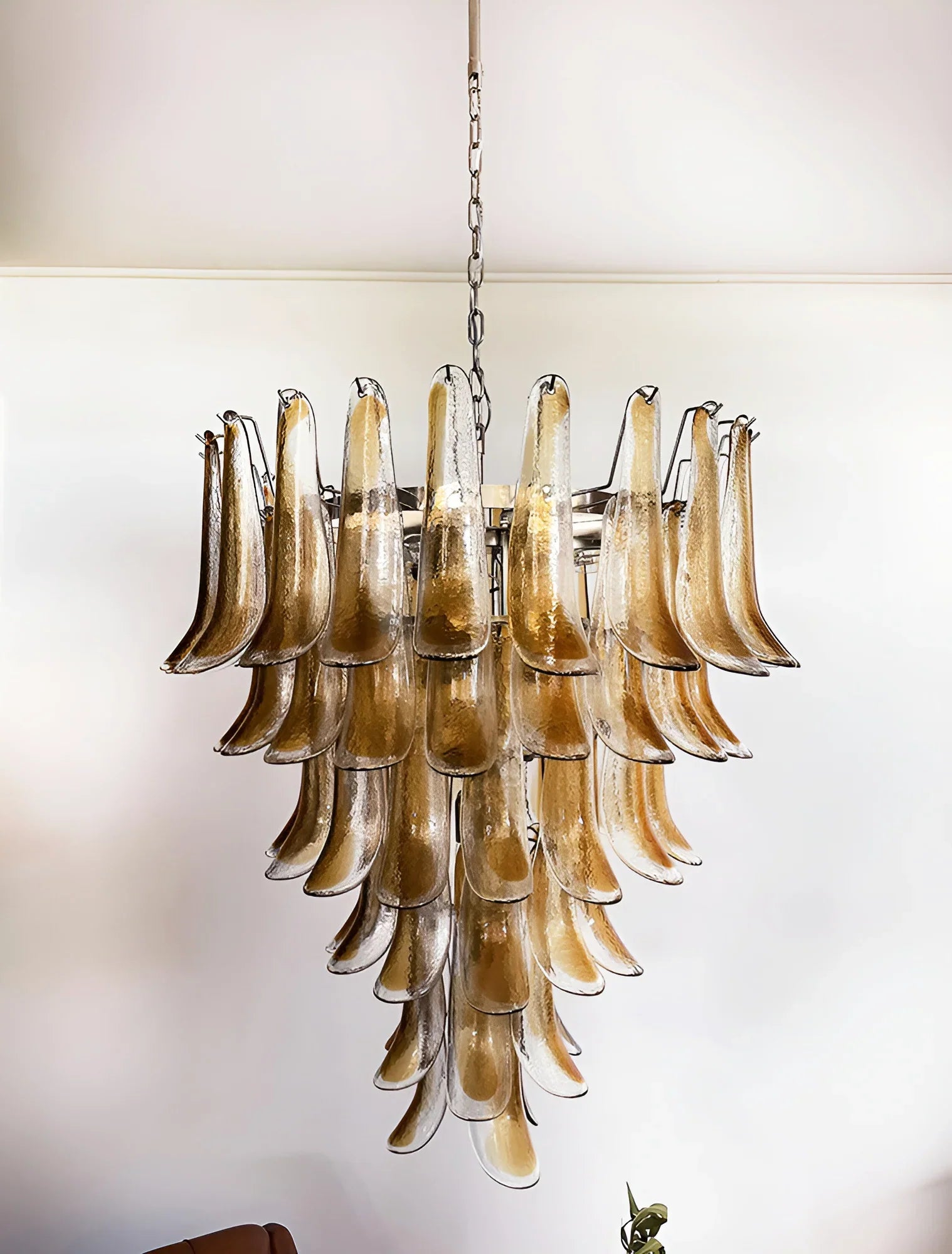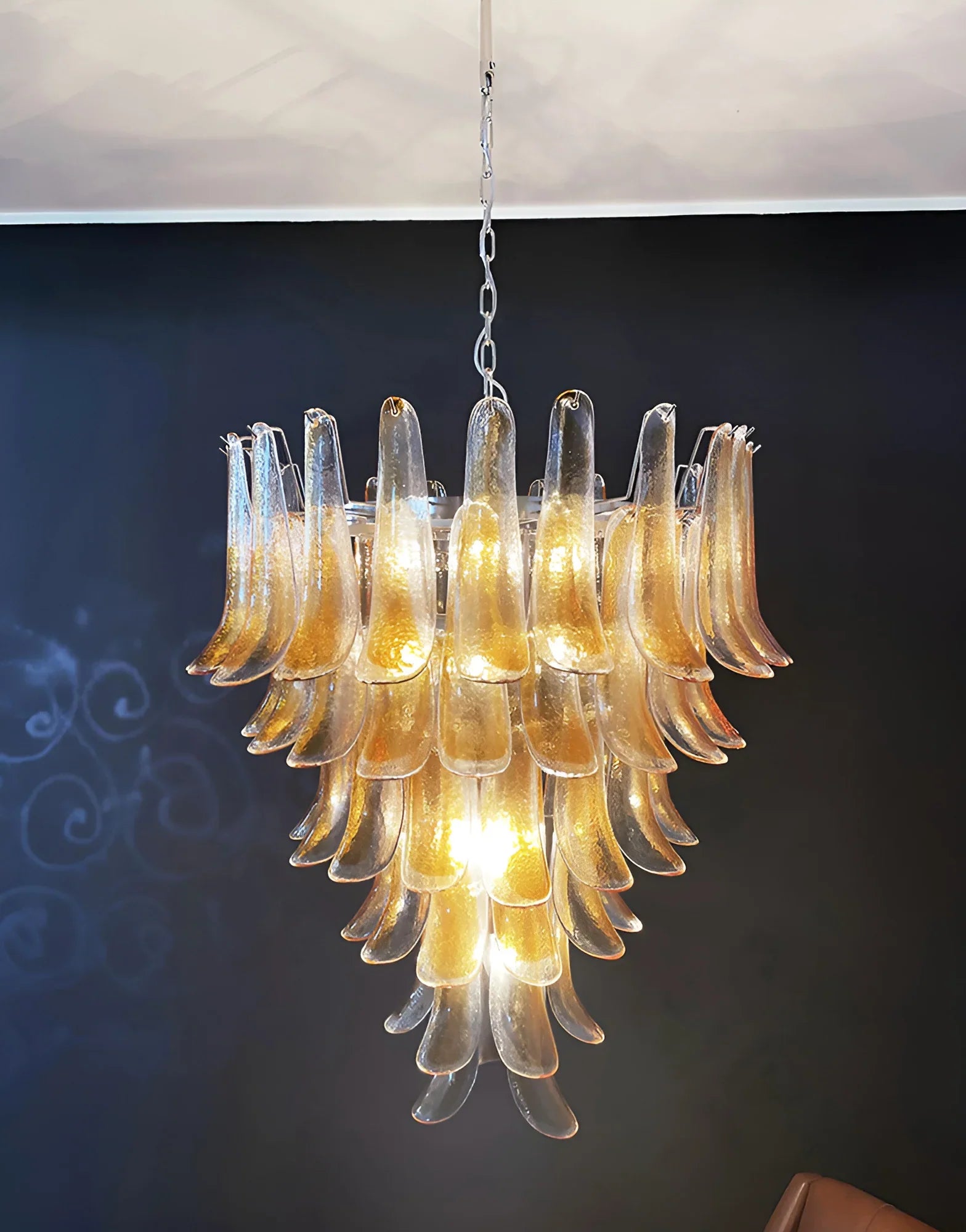 Murano Amber Glass Petals Chandelier . Hand blown glass chandelier composed by glass petals transparent and Amber in a chrome frame. Its soft. warm light creates a cozy and inviting atmosphere. perfect for relaxing.