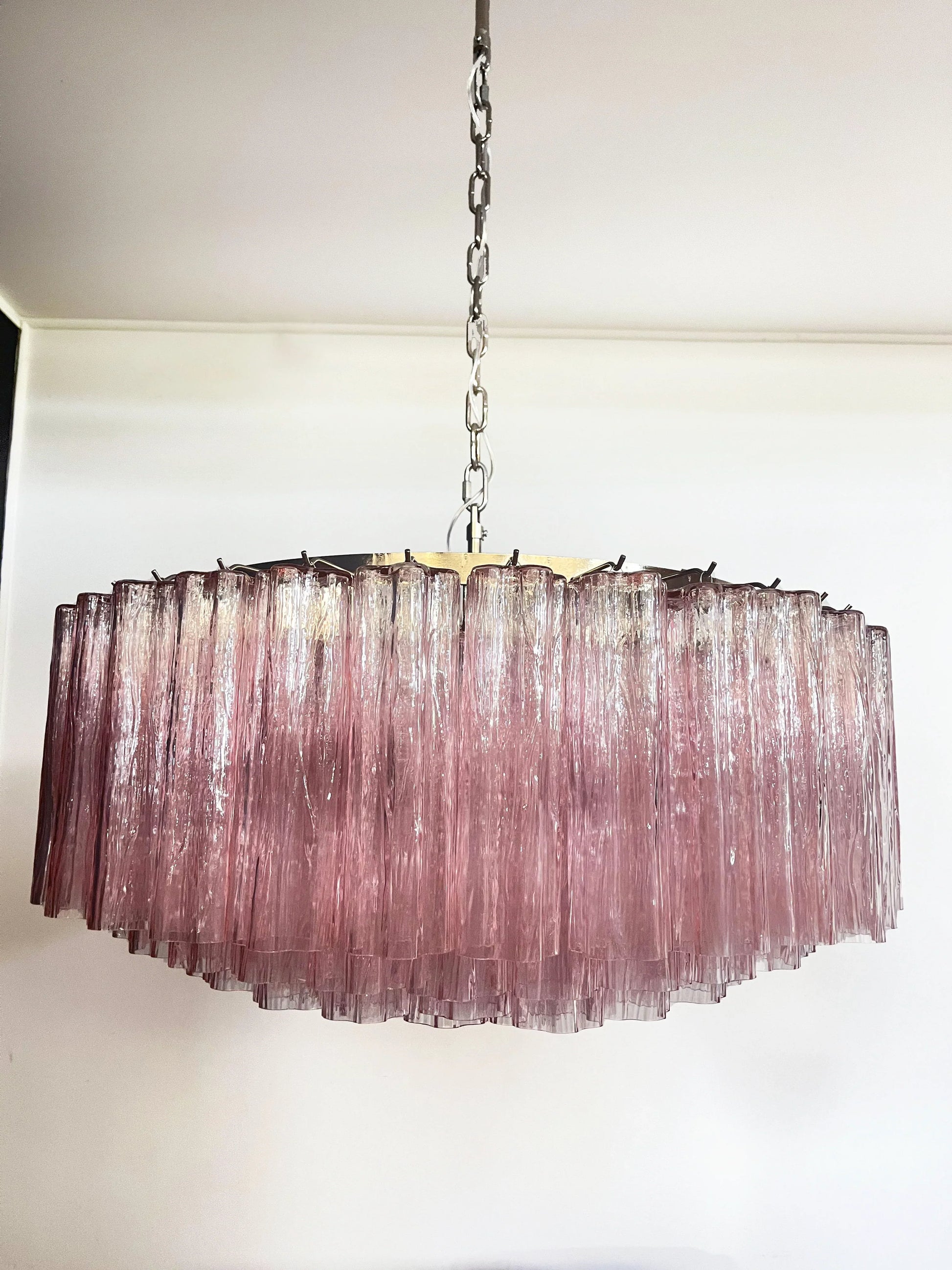Murano Large Pink Glass Tube Chandelier. Add a touch of modern sophistication to your home. This stunning chandelier features Pink glass star tubes. expertly arranged to create a striking visual centerpiece that enhances any room's decor. Each tube is carefully handcrafted to add style and ambience to your space.