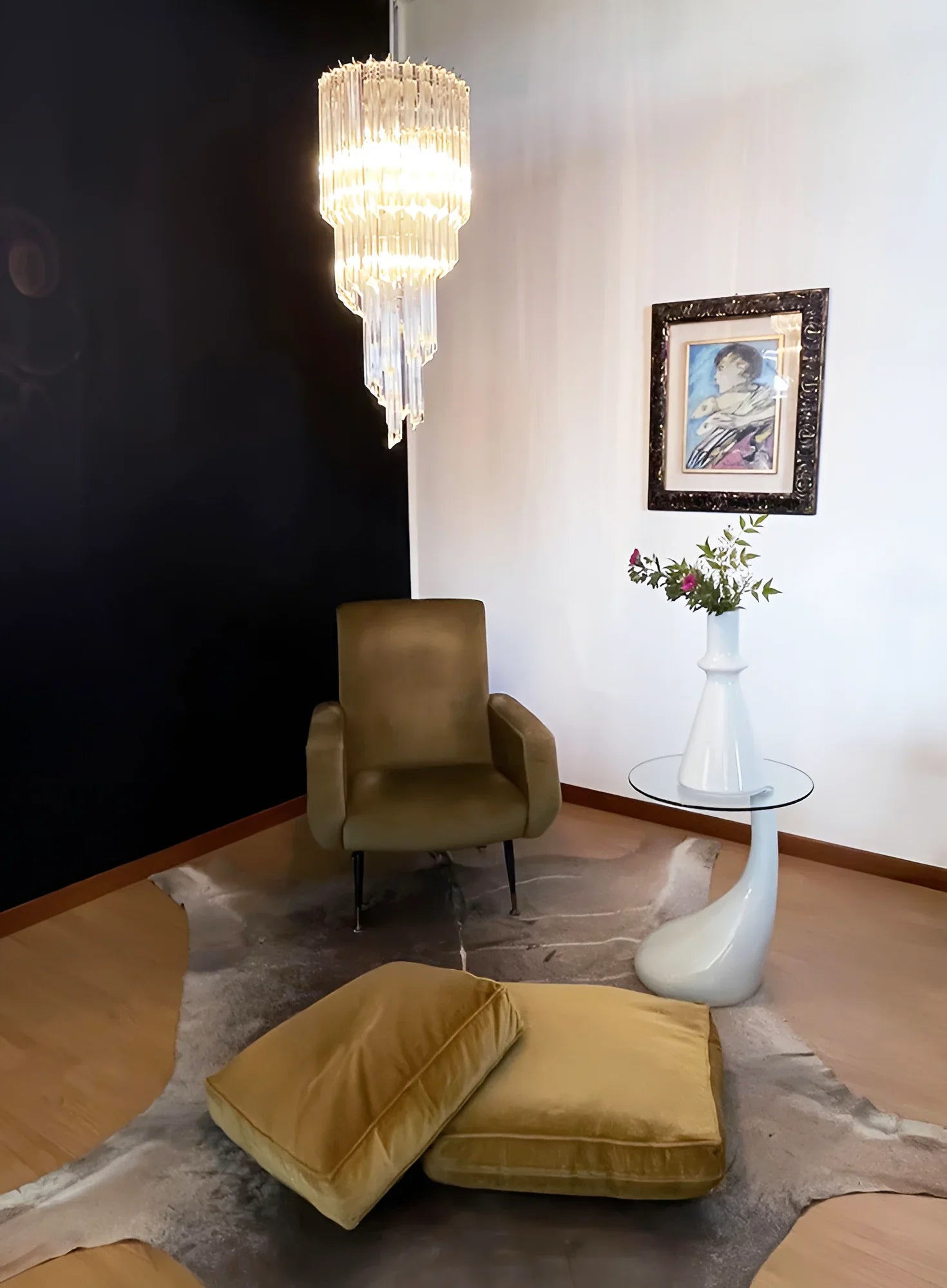 Murano Spiral Prisms Transparent Chandelier. This one-of-a-kind chandelier is made from brilliant Transparent crystal prisms that are beautifully framed in a metal frame. Treat your home to this work of art of a chandelier and let it be the crowning glory of your decor. Whether hanging in a grand room or an elegant entrance area. this chandelier will be a radiant centerpiece that captures everyone's attention with its beauty and brilliance.