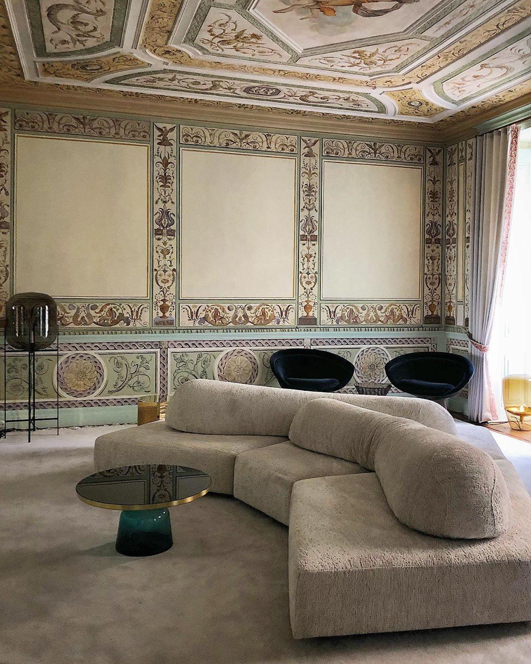 Oda floor lamp with hand blown glass corpus available in Transparent. grey. amber. light blue. Base in half round tube powder coated or chrome. Textile cable with hand switch. black or white.