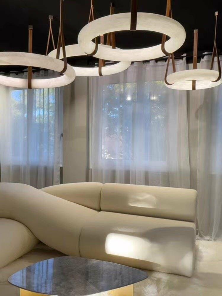 The Oslo Pendant Light B features a glowing alabaster ring. creating a halo effect that beautifully illuminates a room. Hung from sturdy fasteners. this fixture strikes a balance between strength and weightlessness. providing a solid yet airy appearance. As a standalone statement piece. it adds a touch of sophistication. and when grouped together in a row. it amplifies its impact. Optional hanging cables also available for purchase.