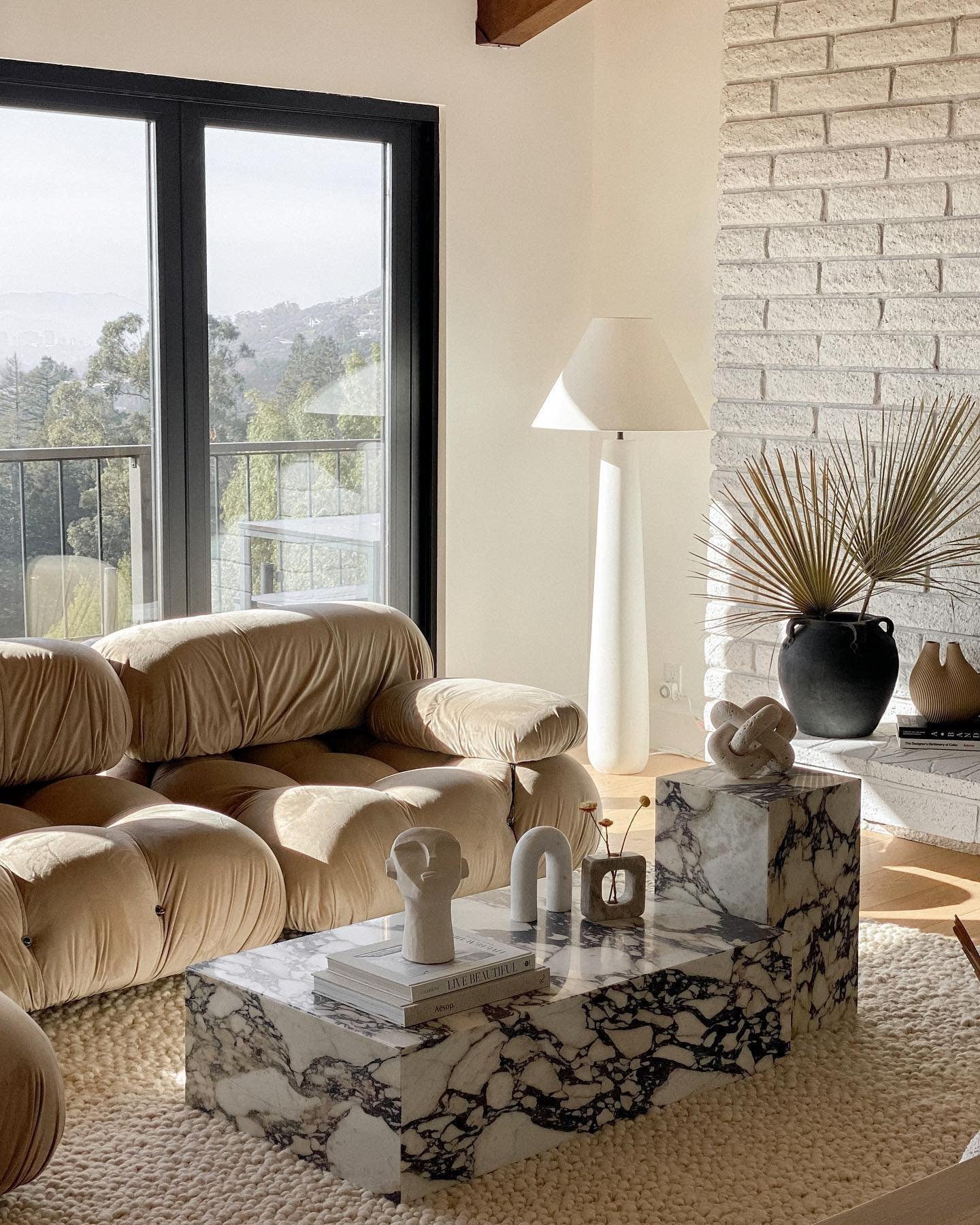 Polar White floor lamp stands on a white wooden base that tapers to an white linen shade. "We're really pushing the limits in terms of scale." explains designer. "We love the more substantial shades." Lamp gives off a soft light. perfect for warming up any space.