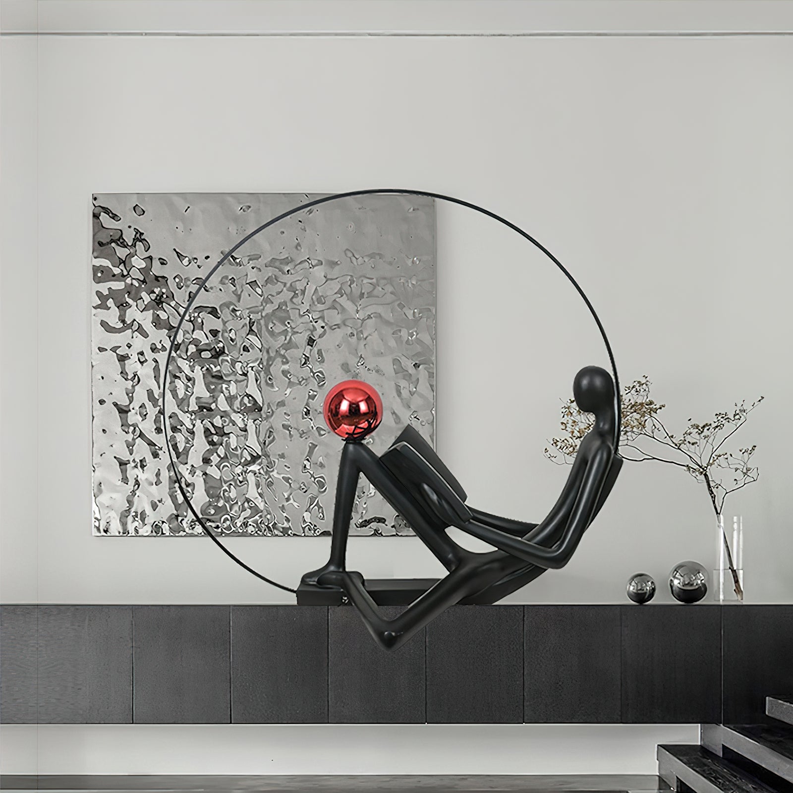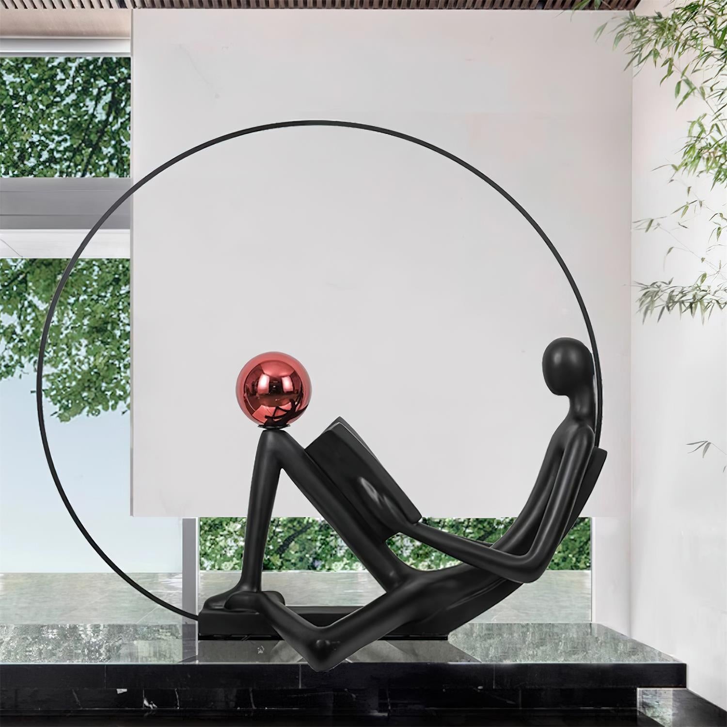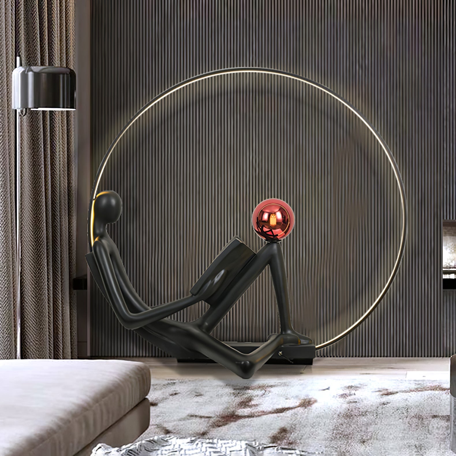 The Reader Sculpture Floor Lamp is inspired by the serene and contemplative act of reading. This artistic floor lamp features a sleek. modern figure in a relaxed pose. engrossed in a book. with a luminous orb beside them. The elegant. circular frame symbolizes the infinite world of knowledge and imagination that books provide.