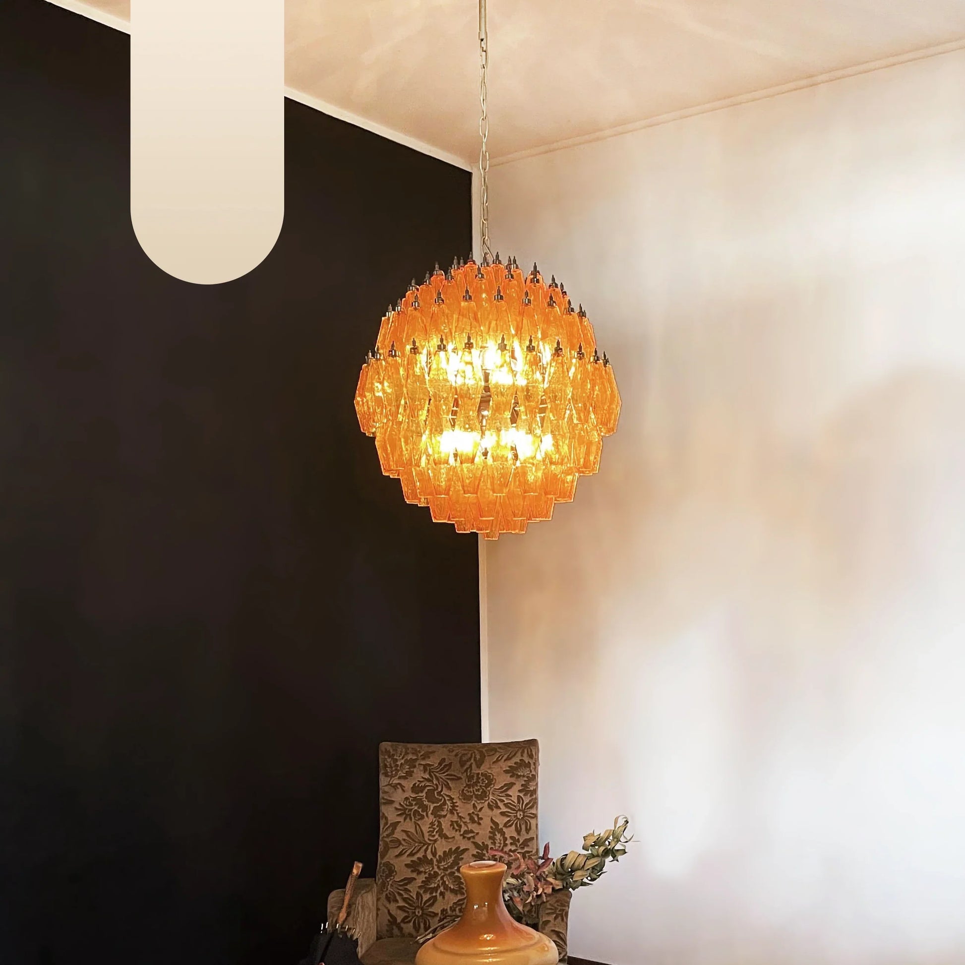 Spherical Murano Poliedri Amber Glass Chandelier. Transform your living space with the a stunning blend of artistic craftsmanship and luxurious design. Featuring amber glass elements. Creates a warm and inviting ambiance. perfect for enhancing any room's decor. Add a touch of luxury to your home.