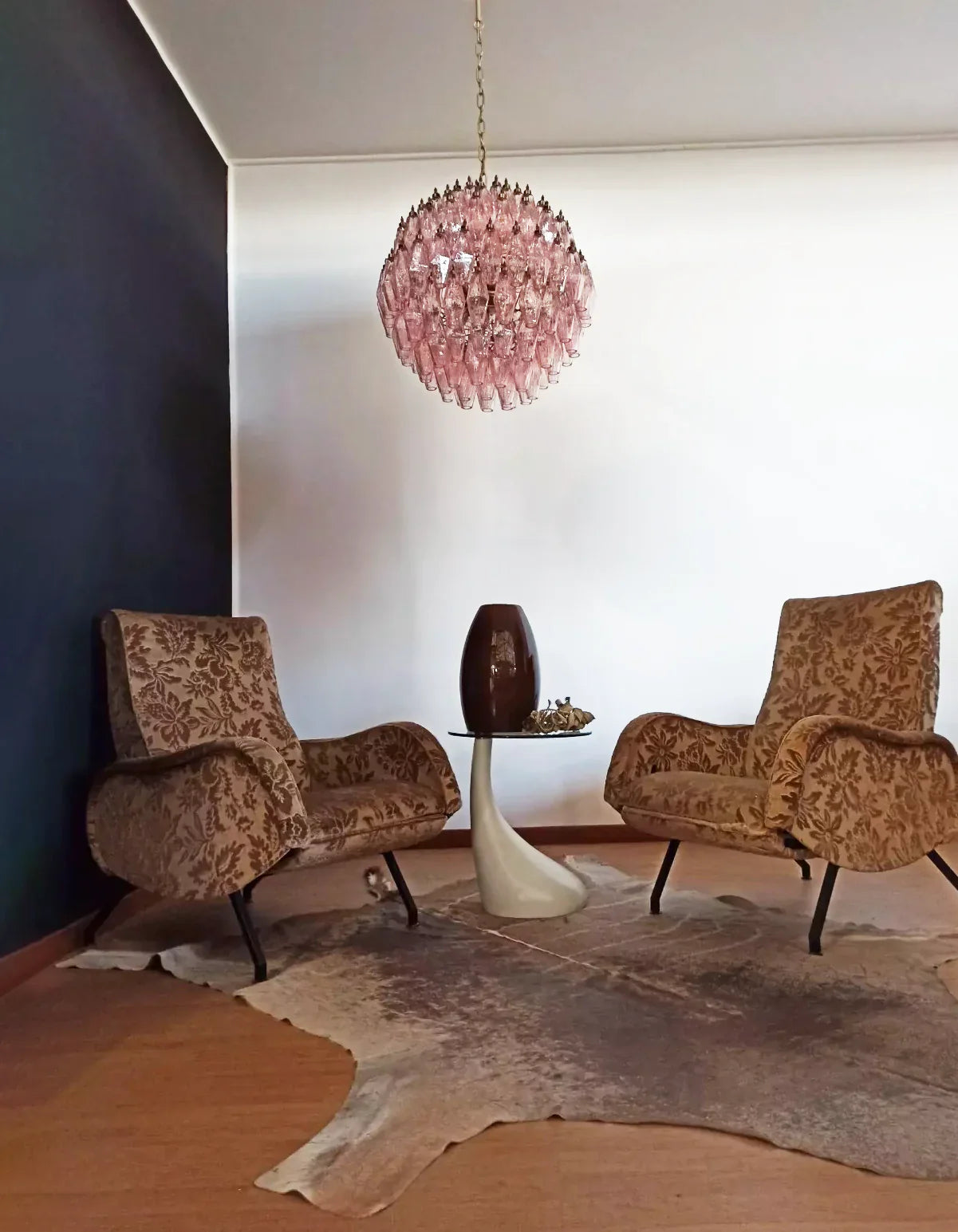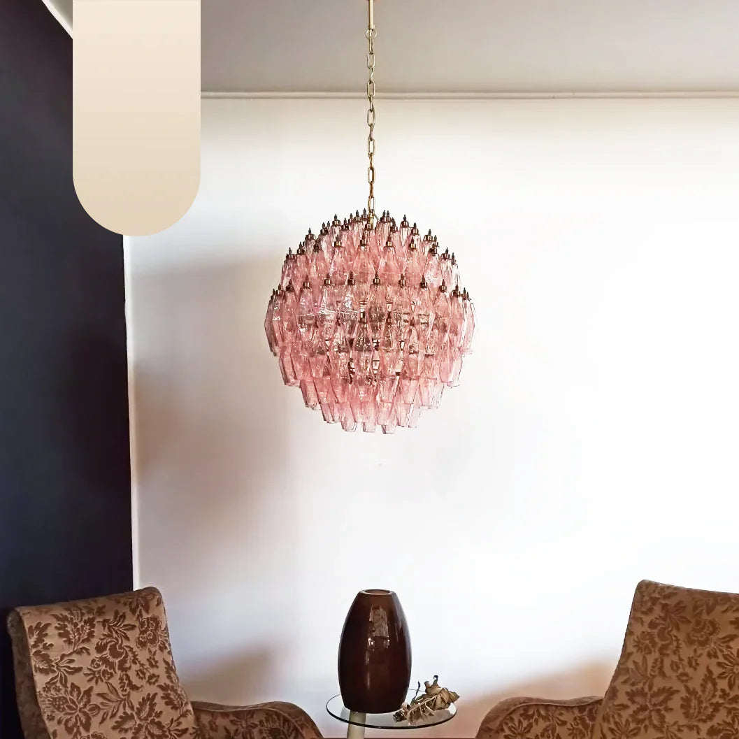 Spherical Murano Poliedri Pink Glass Chandelier. Transform your living space with the a stunning blend of artistic craftsmanship and luxurious design. Featuring Pink glass elements. Creates a warm and inviting ambiance. perfect for enhancing any room's decor. Add a touch of luxury to your home.