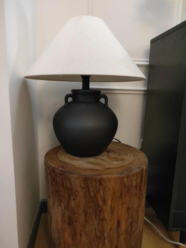 A rustic yet refined table lamp featuring a ceramic base shaped like an ancient amphora. The natural linen lampshade complements the earthy tones. making it an excellent choice for cozy. Mediterranean-inspired interiors.