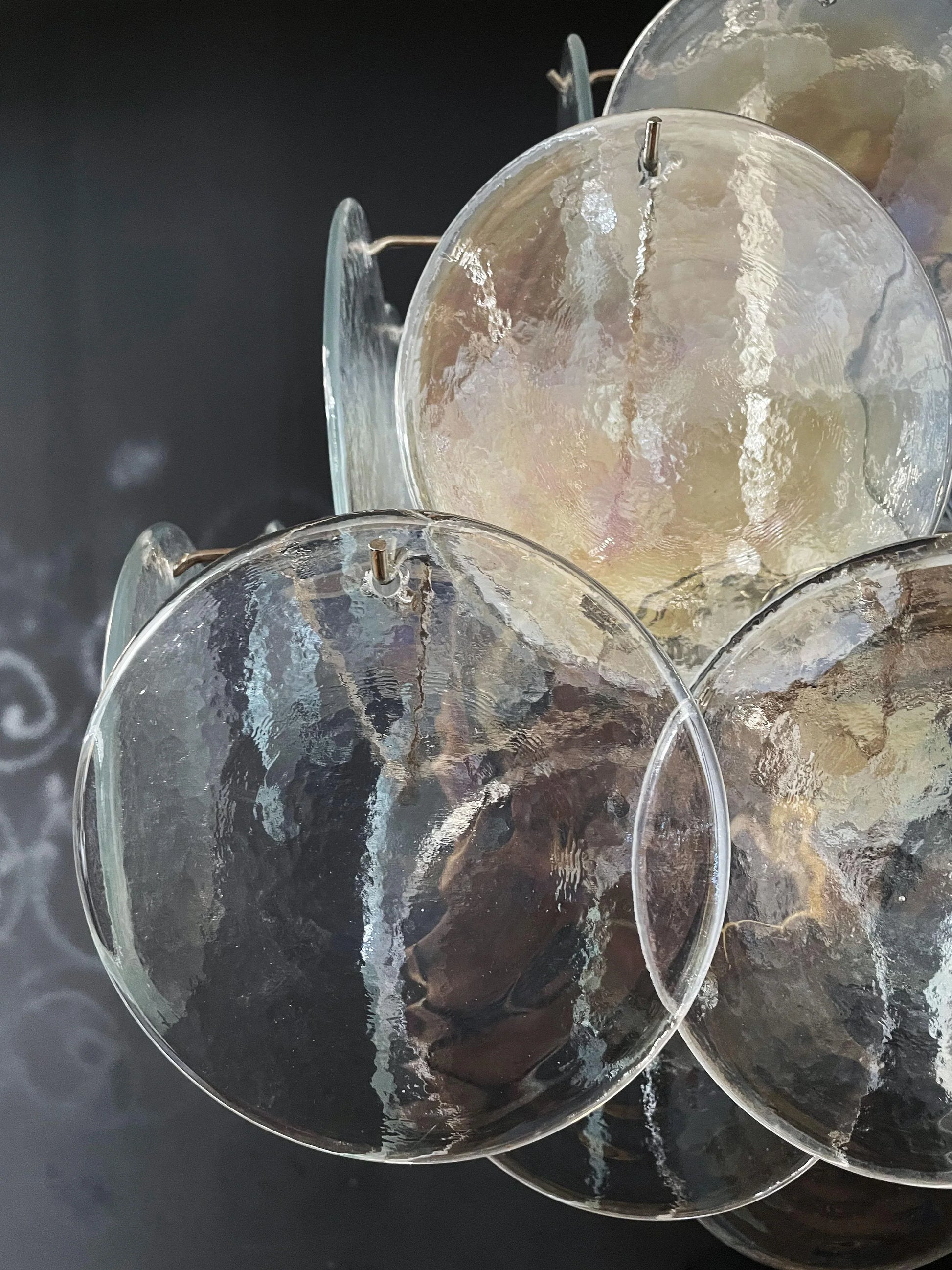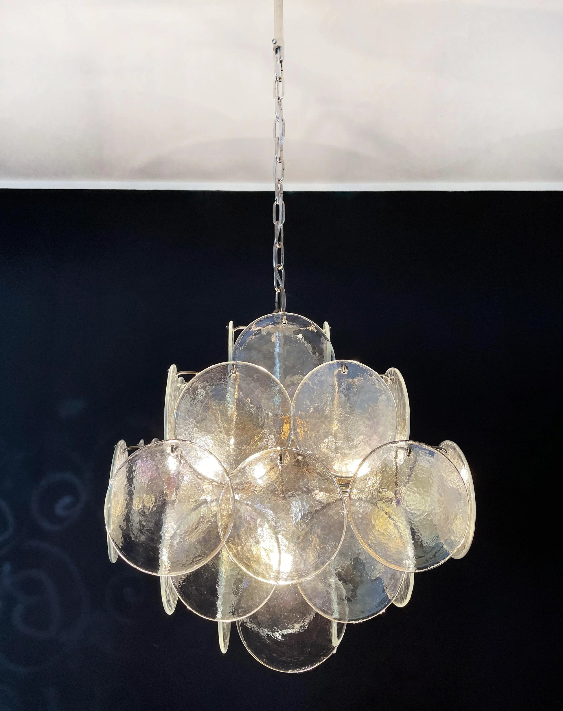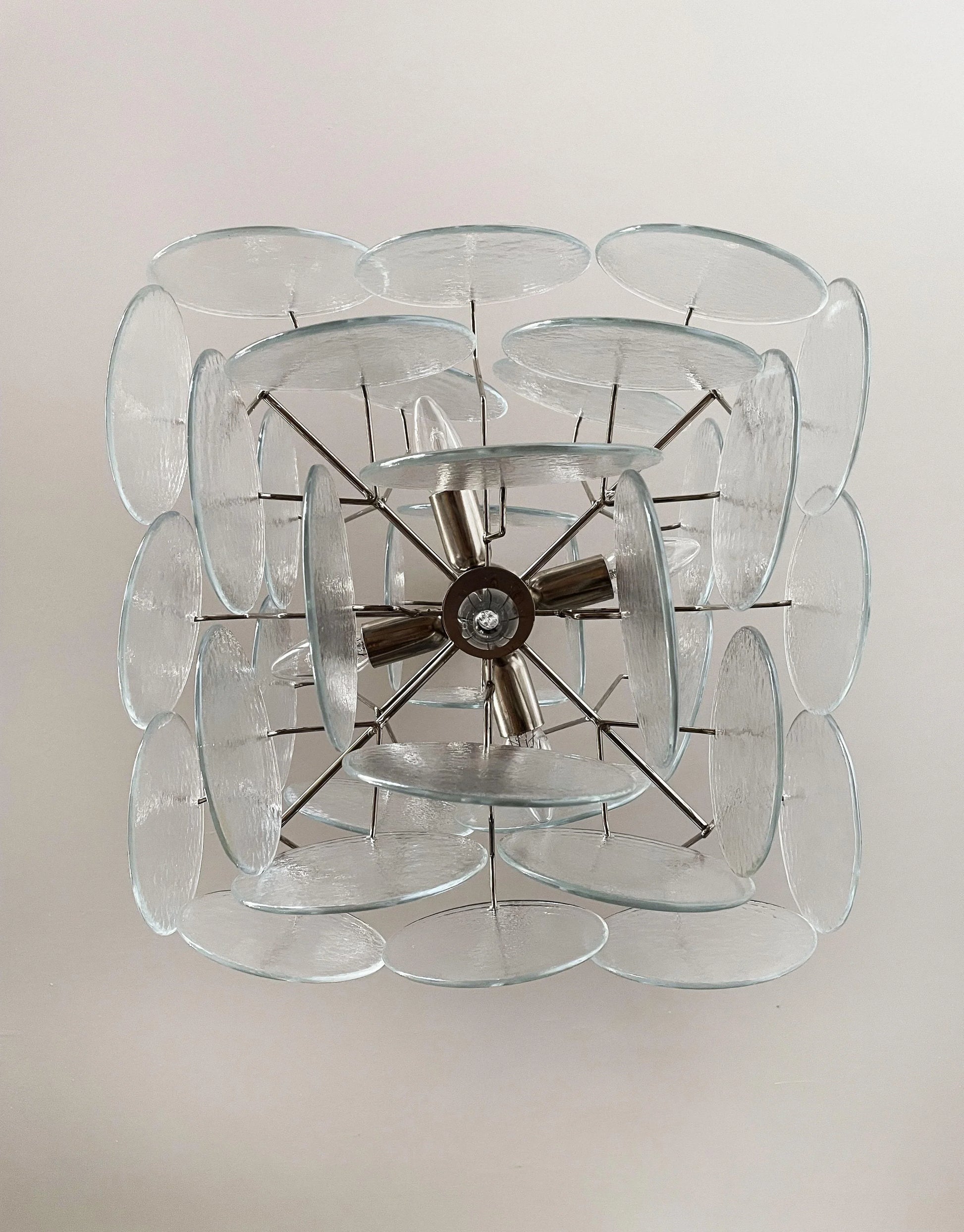 Elevate your space with our Vintage Murano Iridescent Disks Chandelier. This stunning lighting fixture features Iridescent discs in a nickel metal frame. creating a work of art that not only brightens your space. but also brings an air of sophistication and elegance. Transform any room into an enchanting and illuminating space with this chandelier.
