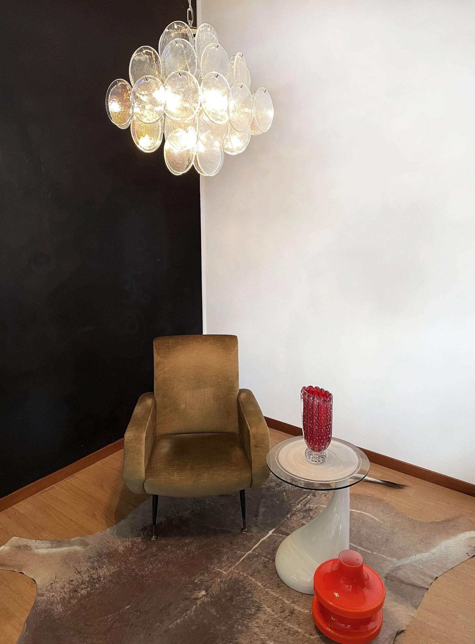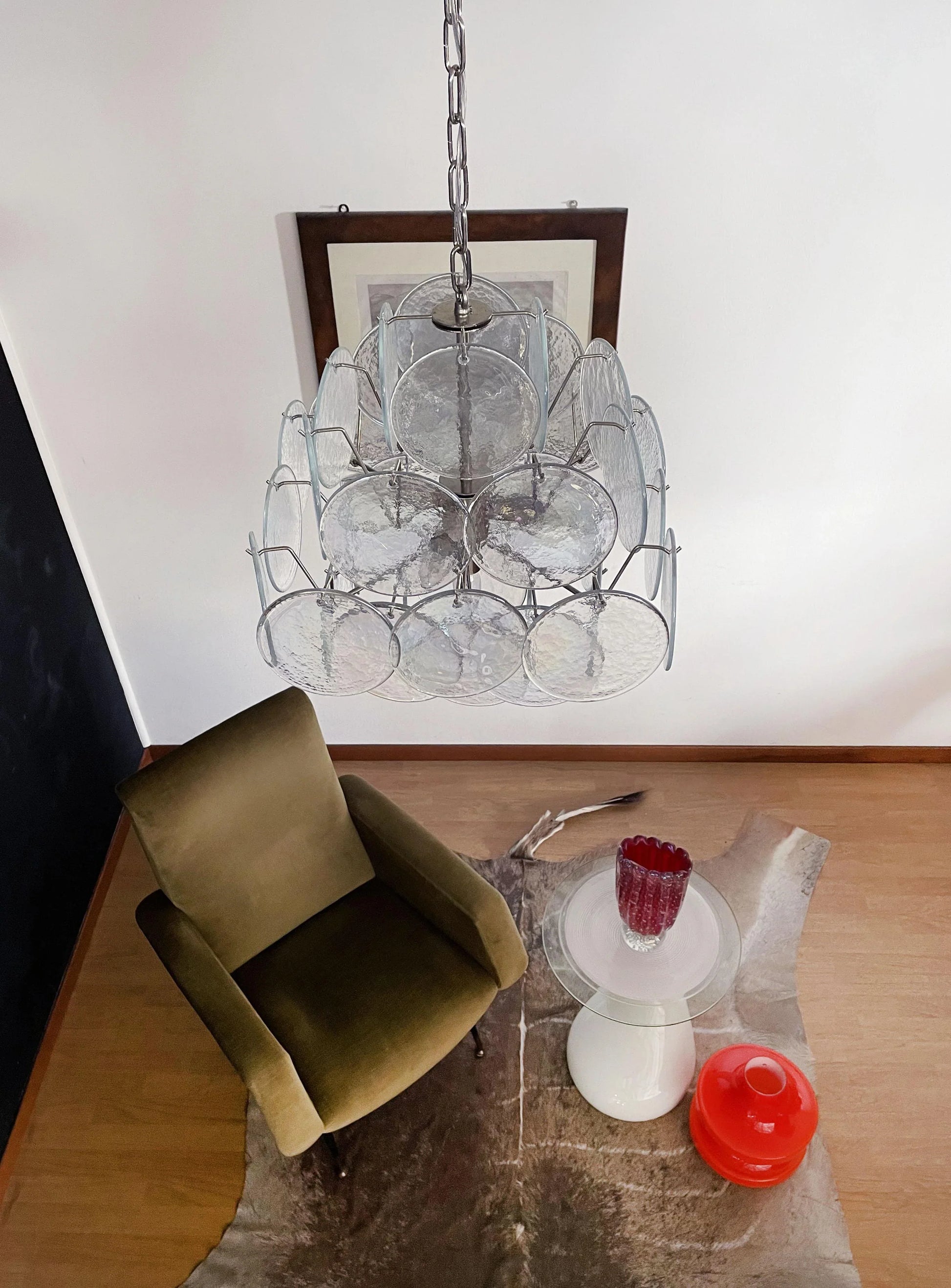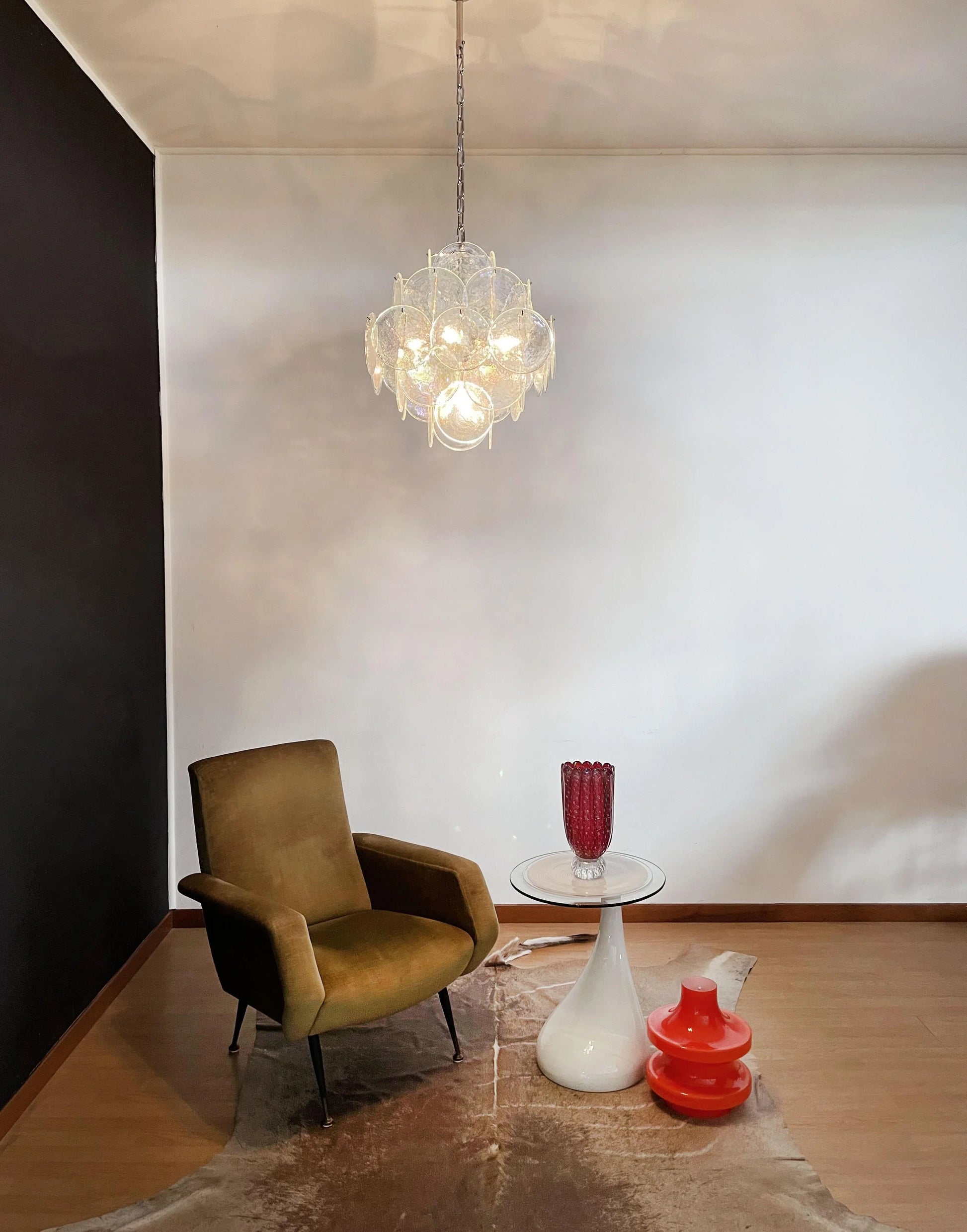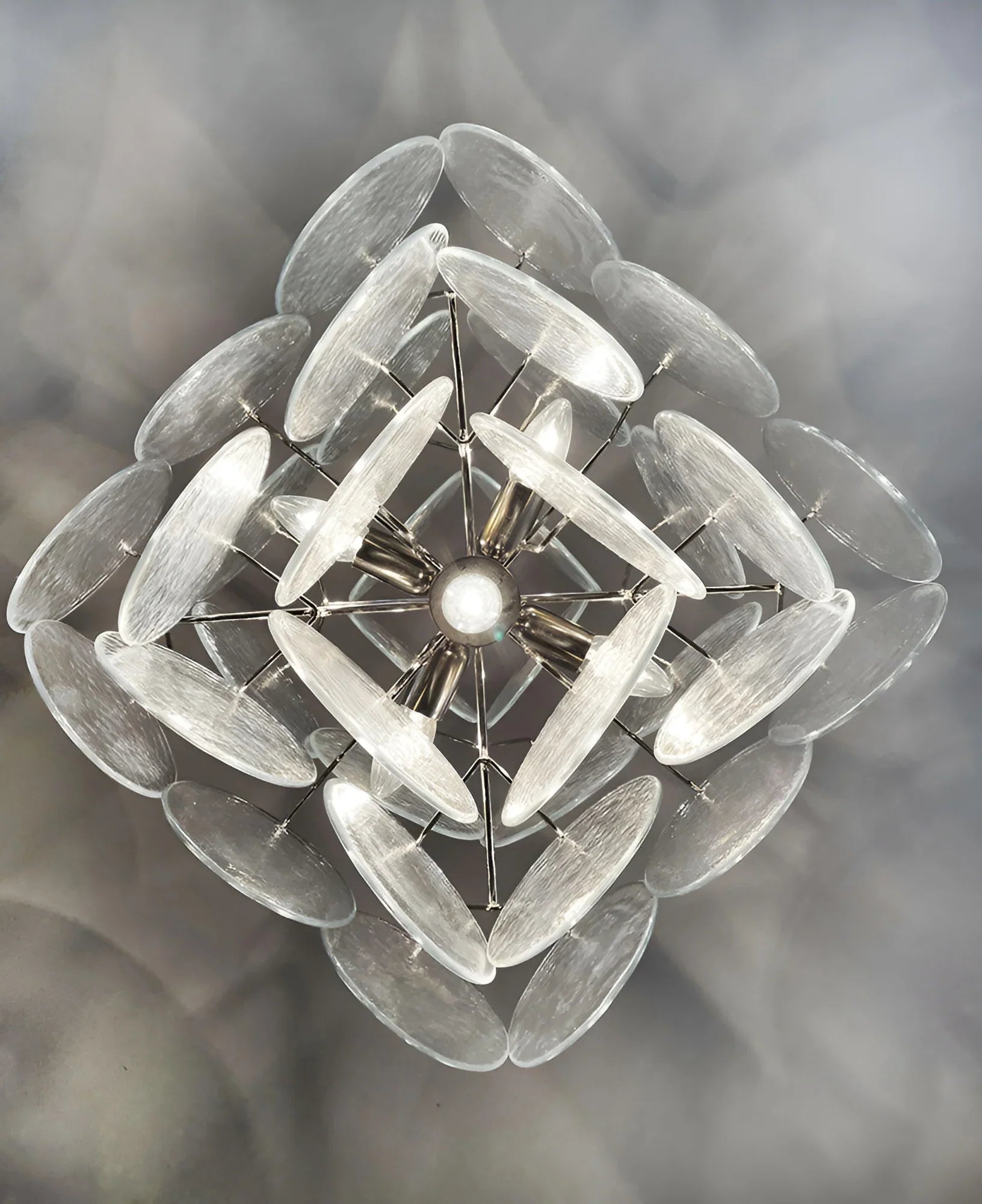 Elevate your space with our Vintage Murano Iridescent Disks Chandelier. This stunning lighting fixture features Iridescent discs in a nickel metal frame. creating a work of art that not only brightens your space. but also brings an air of sophistication and elegance. Transform any room into an enchanting and illuminating space with this chandelier.