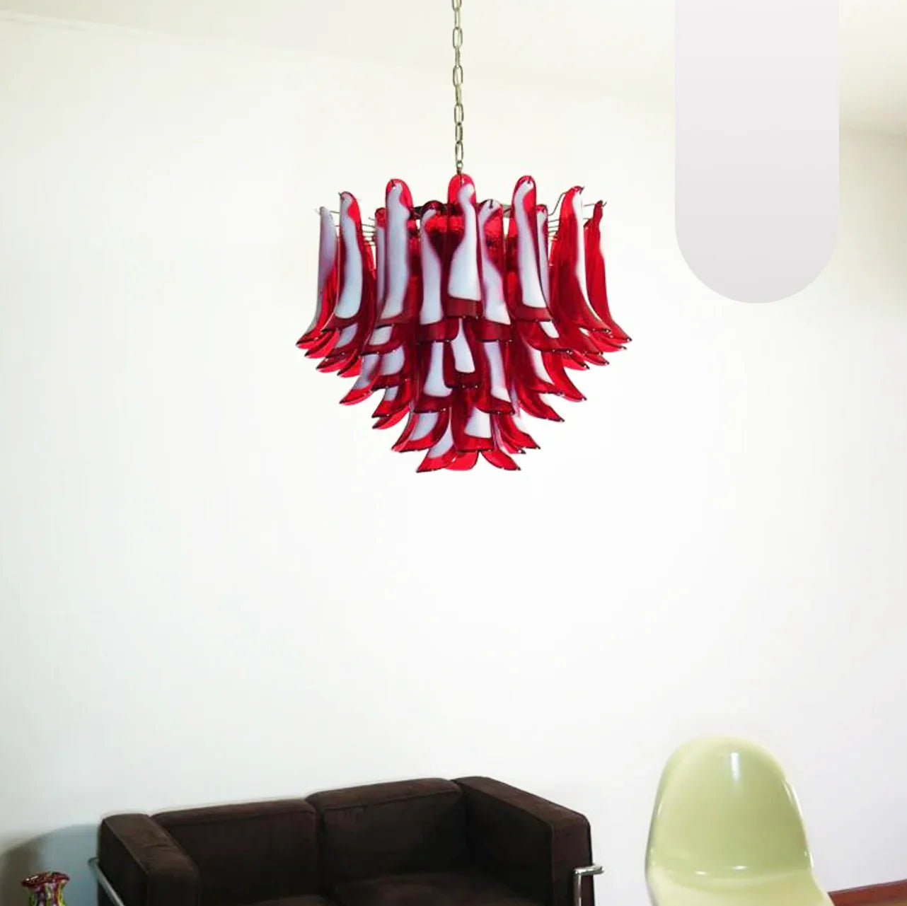 Vintage Red Glass Murano Petals Chandelier. Create a cozy atmosphere for any space This stunning piece features Red Glass Blades. creating a one-of-a-kind atmosphere that exudes glamour and sophisticated elegance. Elevate your lighting with this must-have statement piece.