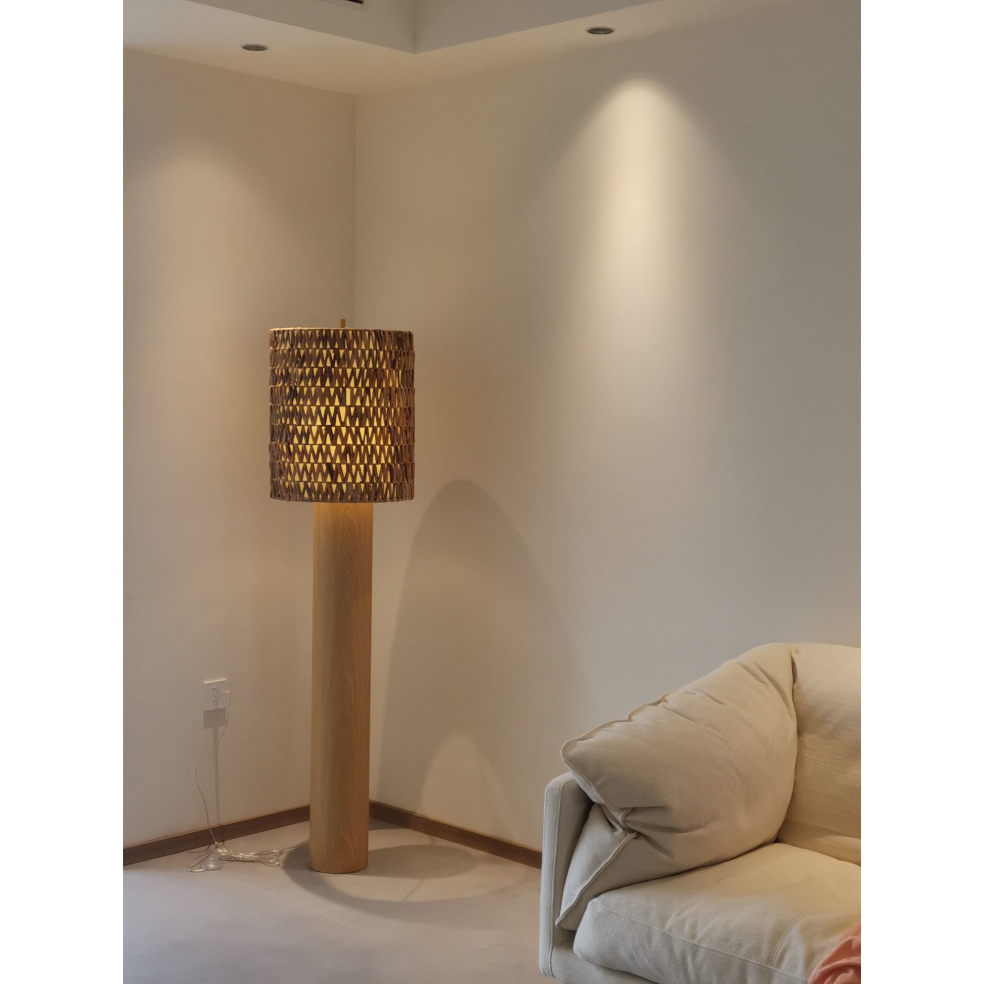 We love our Brodie floor lamp's bold proportions and fresh combination of natural materials. The lamp's wooden column stands tall. supporting a drum-shaped shade made from rattan fibers. creating a warm. cozy atmosphere. Woven into a graphic chevron pattern. the shade perfectly complements the wooden base's lively grain with organic texture.
