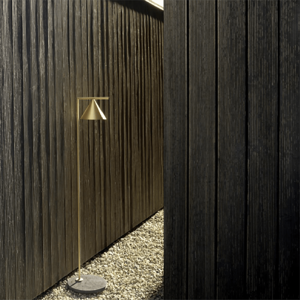 Sleek and graceful. this versatile floor lamp features smart details from head to toe. At the top. its spinning cone diffuser provides direct light that can be repositioned. On the bottom. it is weighted by a stunning white Carrara or black Marquina marble base. Its stem and cone are available in painted steel or brushed brass. The diffuser is an injection-molded opal photoengraved PC (polycarbonate). Its power cord measures 200 centimeters and features a foot switch with ON-OFF functions.