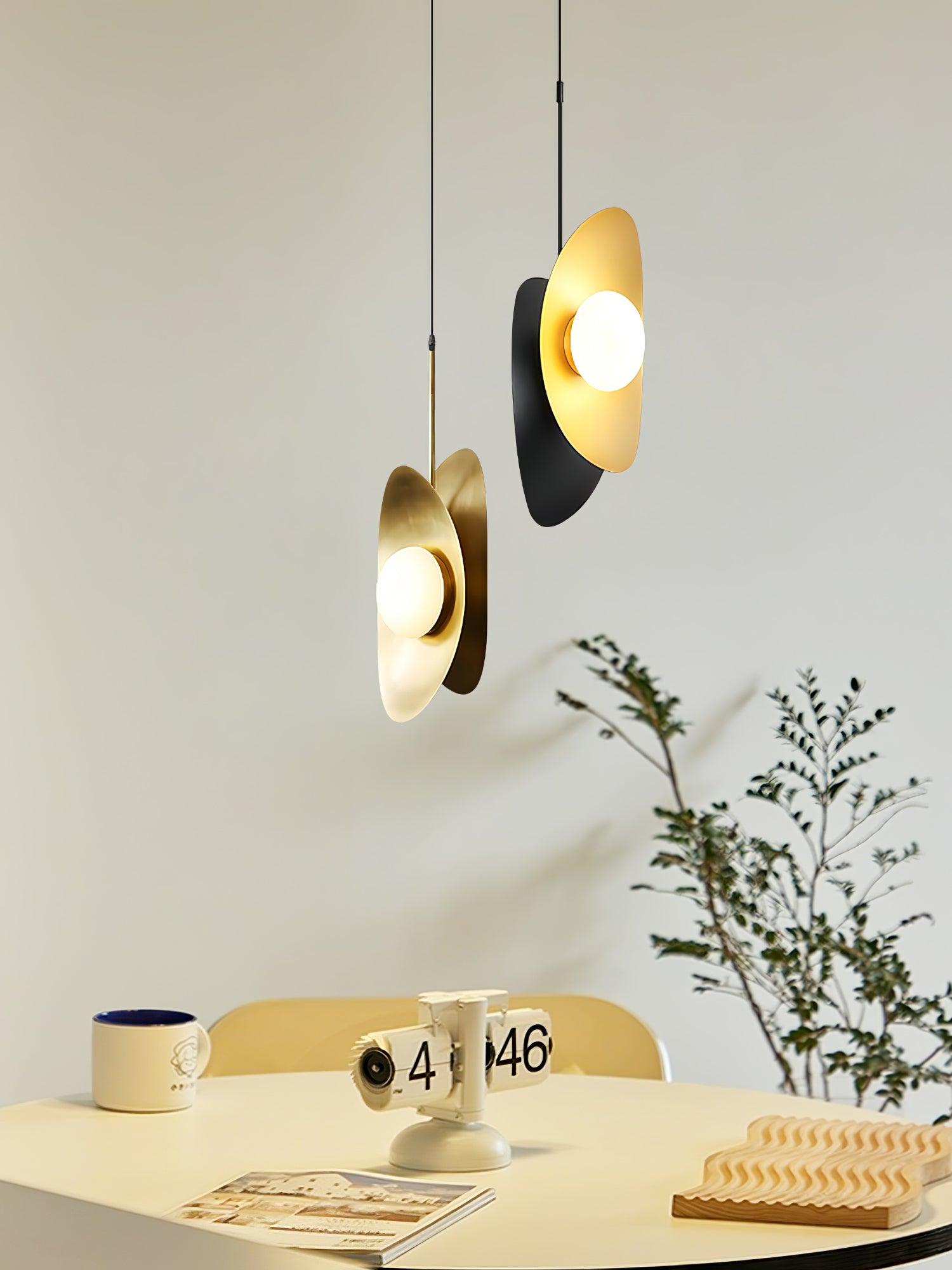 The Golden Petal Pendant Lamp offers a modern and minimalistic design with a contrast of golden metal plates and a center white globe. giving off an aura of soft and artistic light. Its curved metallic form gracefully embraces the light. making it a stylish and luxurious addition to any space.