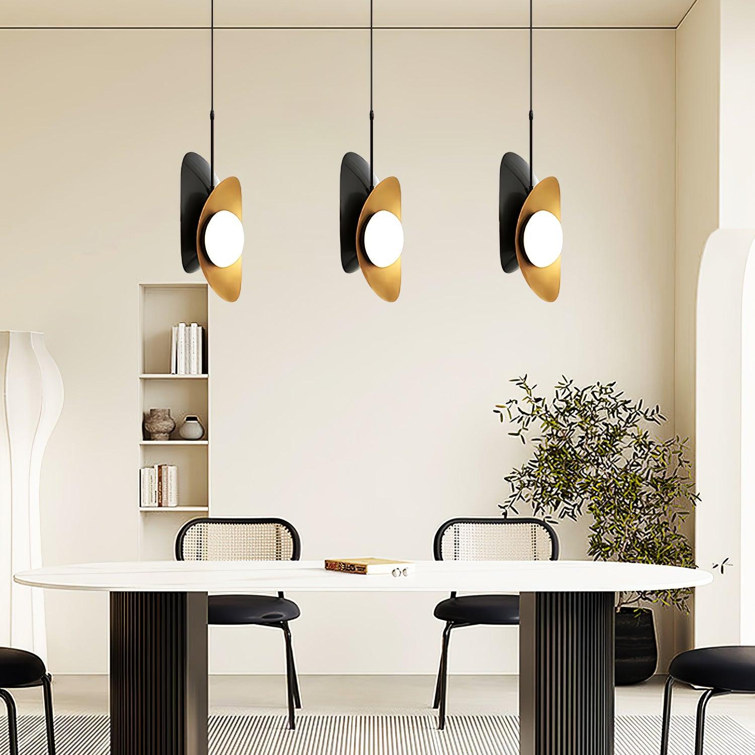 The Golden Petal Pendant Lamp is a stylish double pendant that combines polished gold. and black for an elegant aesthetic. Each pendant is set off with a white glass ball for a modern look. Bold yet simple. it's perfect for any decor.
