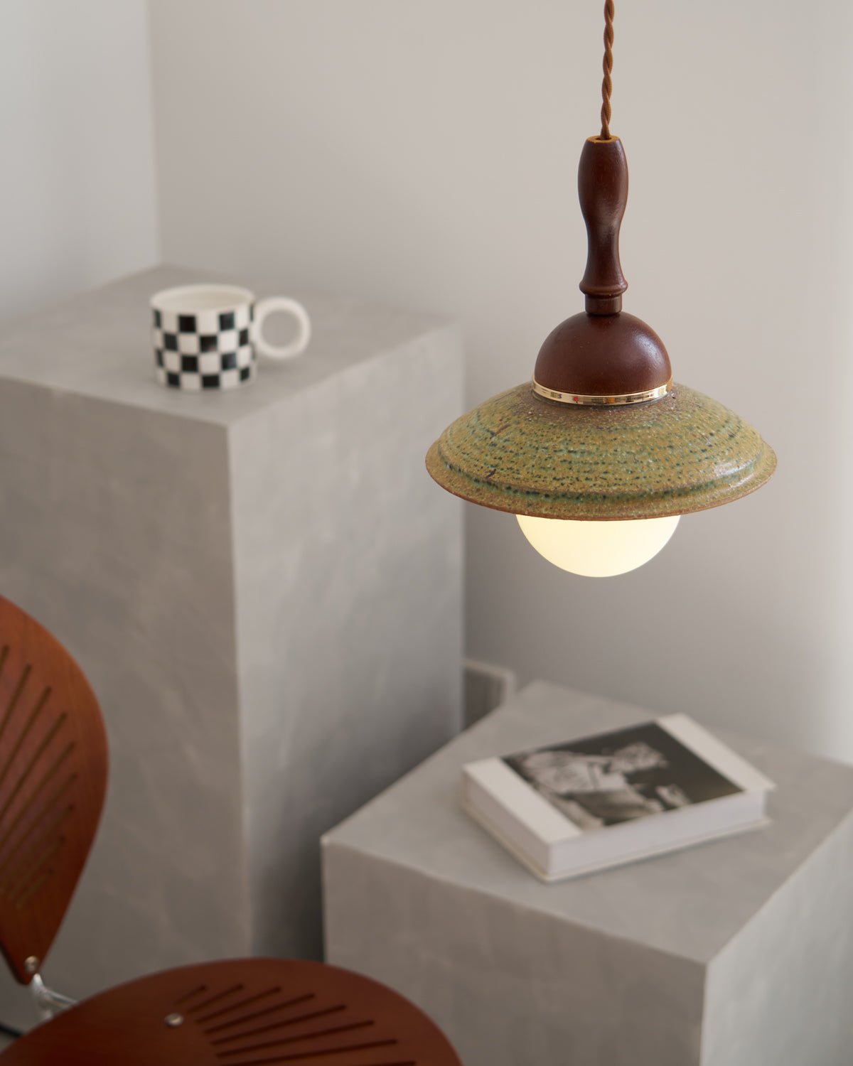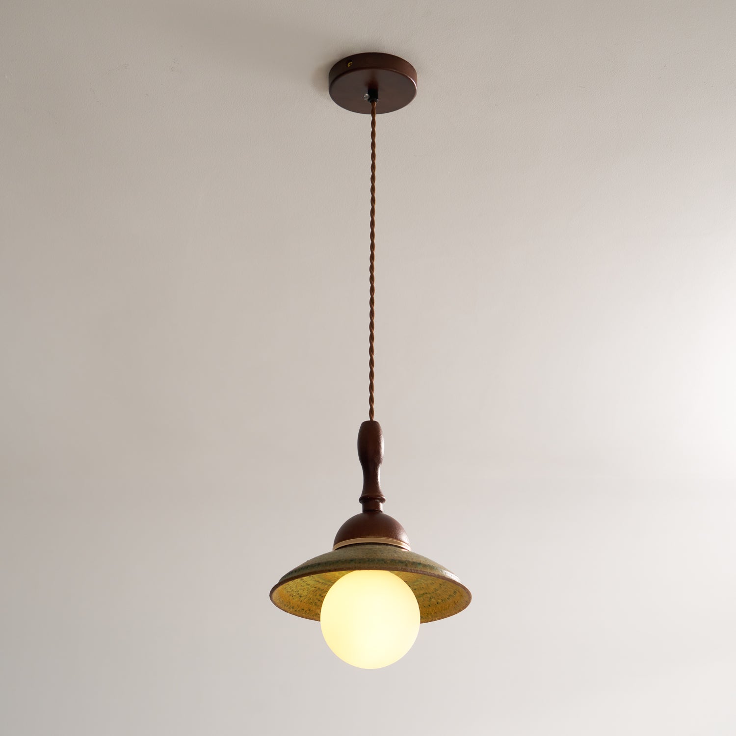 The Greenfield Pendant Lamp adds a touch of rustic elegance to any space. Its green glass shade and wooden cover create a warm. cozy ambiance reminiscent of country living. Hang it over a kitchen counter or dining area for a touch of nostalgia and character.