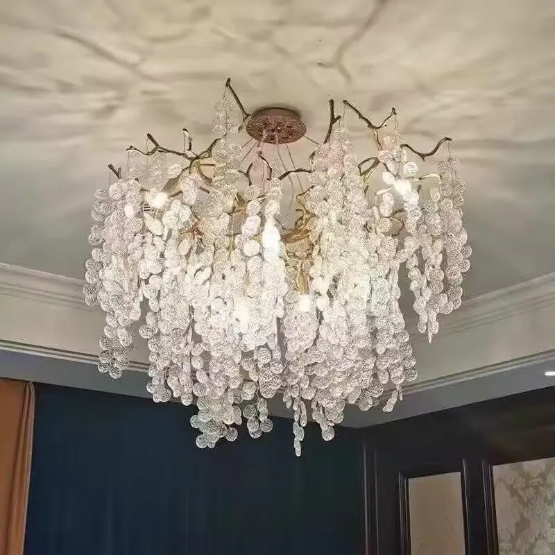 Like dewdrops under a forest canopy, the Shiro Noda Chandelier collection displays glistening glass coins that cascade from organic leaves and branches. A modern nod to nature, this collection is a natural in contemporary settings. This chandelier is large enough to hang in a great room, foyer, or dining and living rooms with high ceilings.