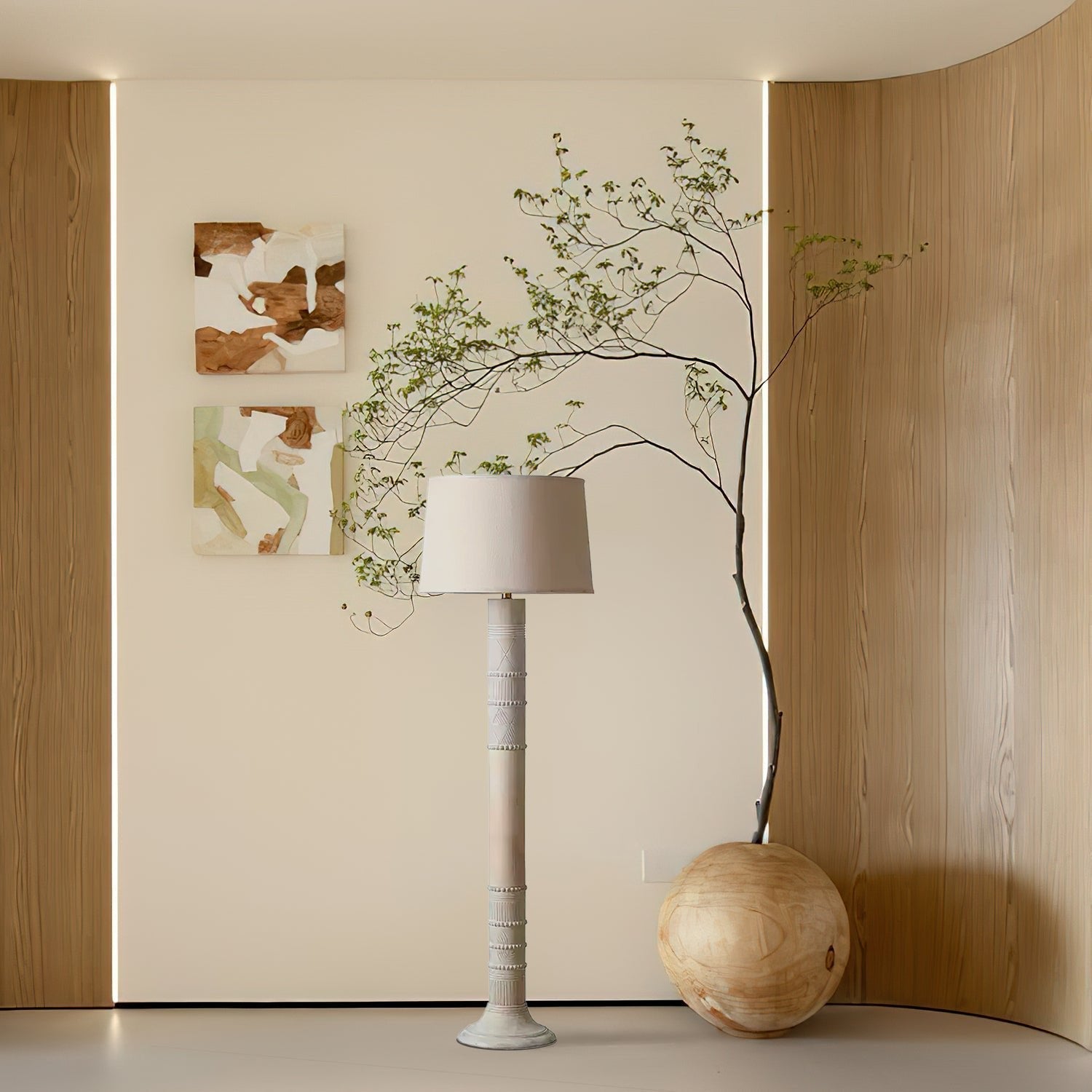 Elevate your living space with the rustic charm of the Sylvan Grace Floor Lamp. Featuring a beautifully crafted wooden base with intricate carved details, this floor lamp exudes natural elegance. The neutral-toned fabric shade complements the warm wood tones, offering soft, ambient lighting perfect for creating a cozy atmosphere in any room. Ideal for modern, rustic, or bohemian interiors, the Sylvan Grace Floor Lamp is both functional and decorative, making it a stunning focal point in your home.